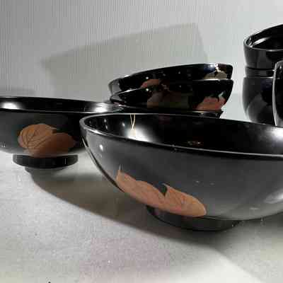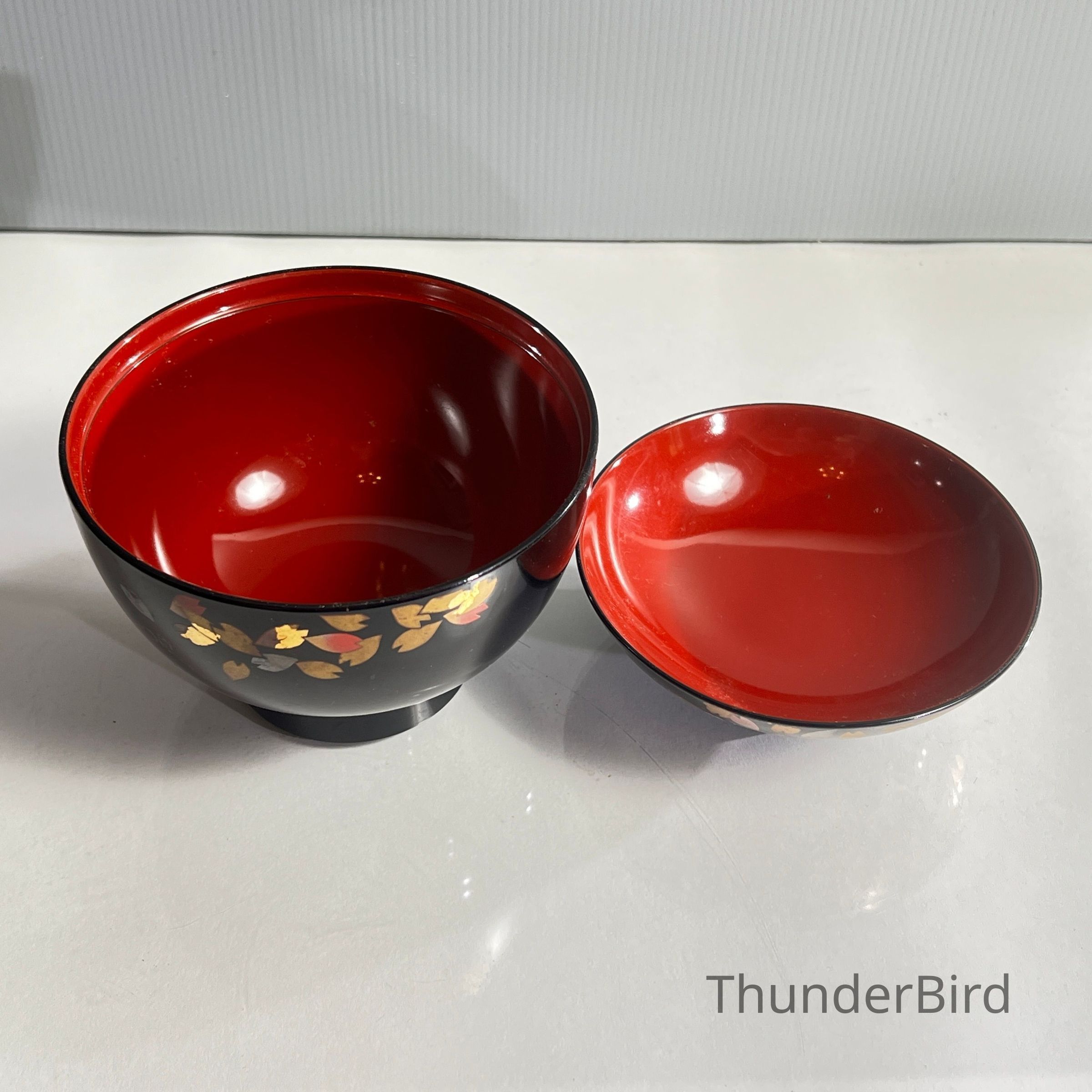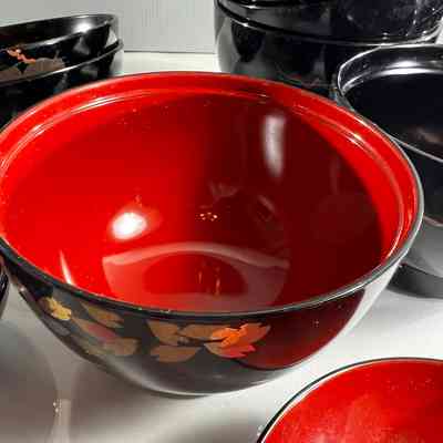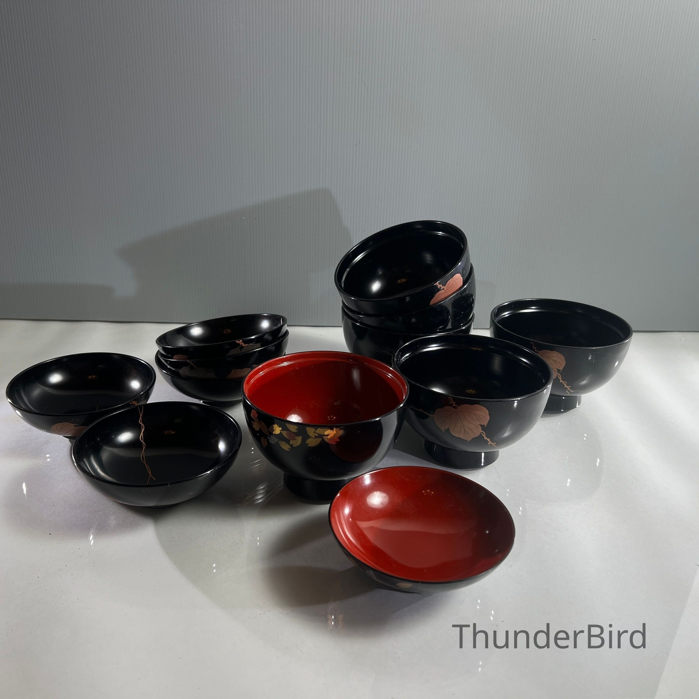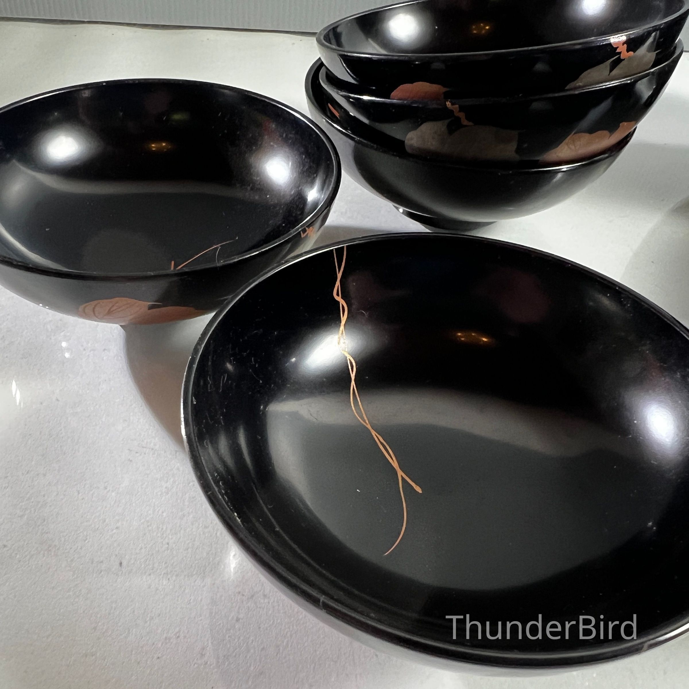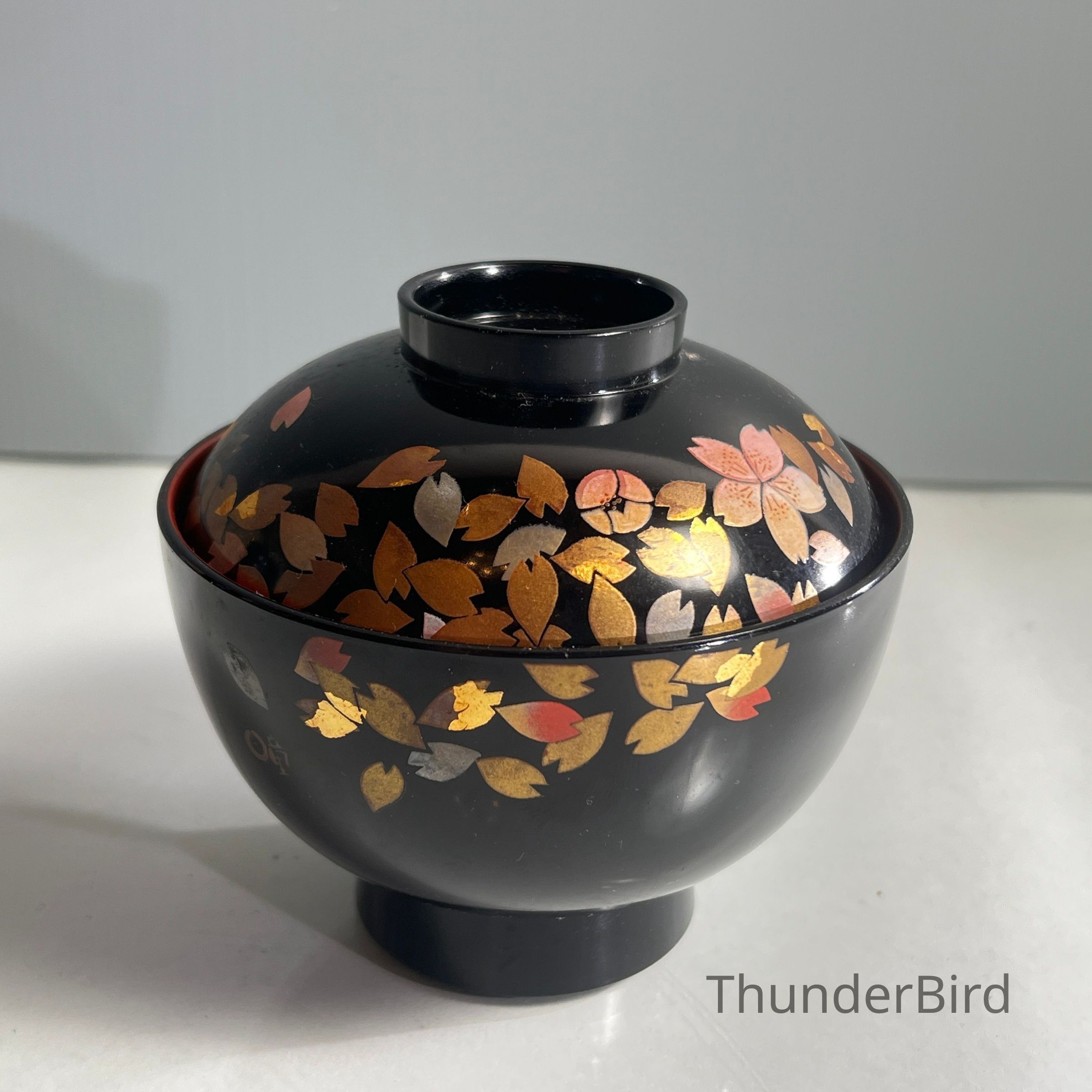 A beautiful vintage Japanese lacquerware set featuring six lidded soup/noodle bowls, each decorated with hand-painted gold and copper botanical motifs. Five bowls feature a black interior with matching lids and a red maker’s seal to the base; one bowl has a traditional vermillion-red interior. Classic Japanese lacquerware, lightweight yet durable, and ideal for serving or display.