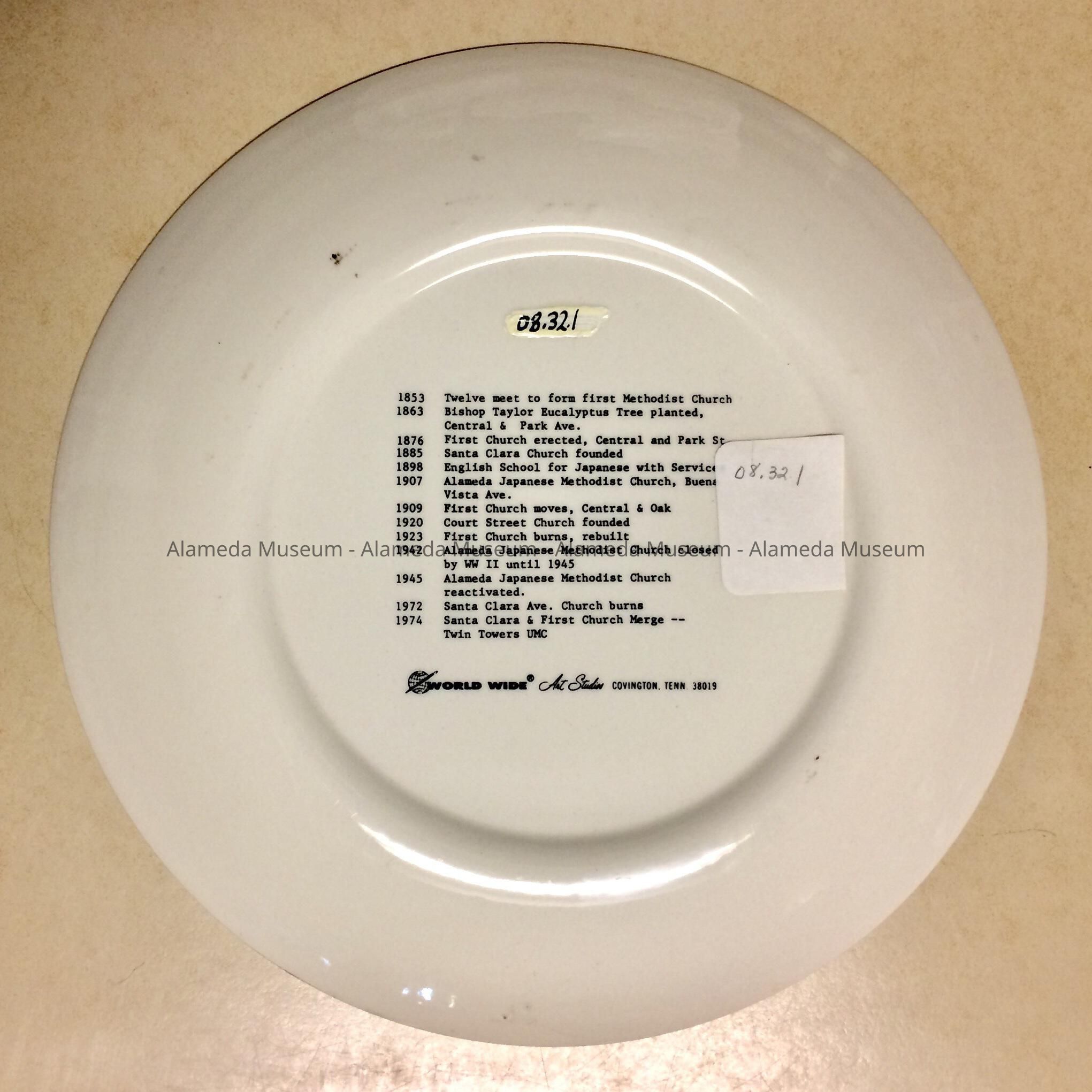 HISTORY OF OBJECT: A SOUVENIR PLATE COMMEMORATING THE ESTABLISHMENT OF THE METHODIST CHURCH IN ALAMEDA, FOUNDED IN 1853. ILLUSTRATIONS ON PLATE INCLUDE BUENA VISTA, COURT, AND TWIN TOWERS.