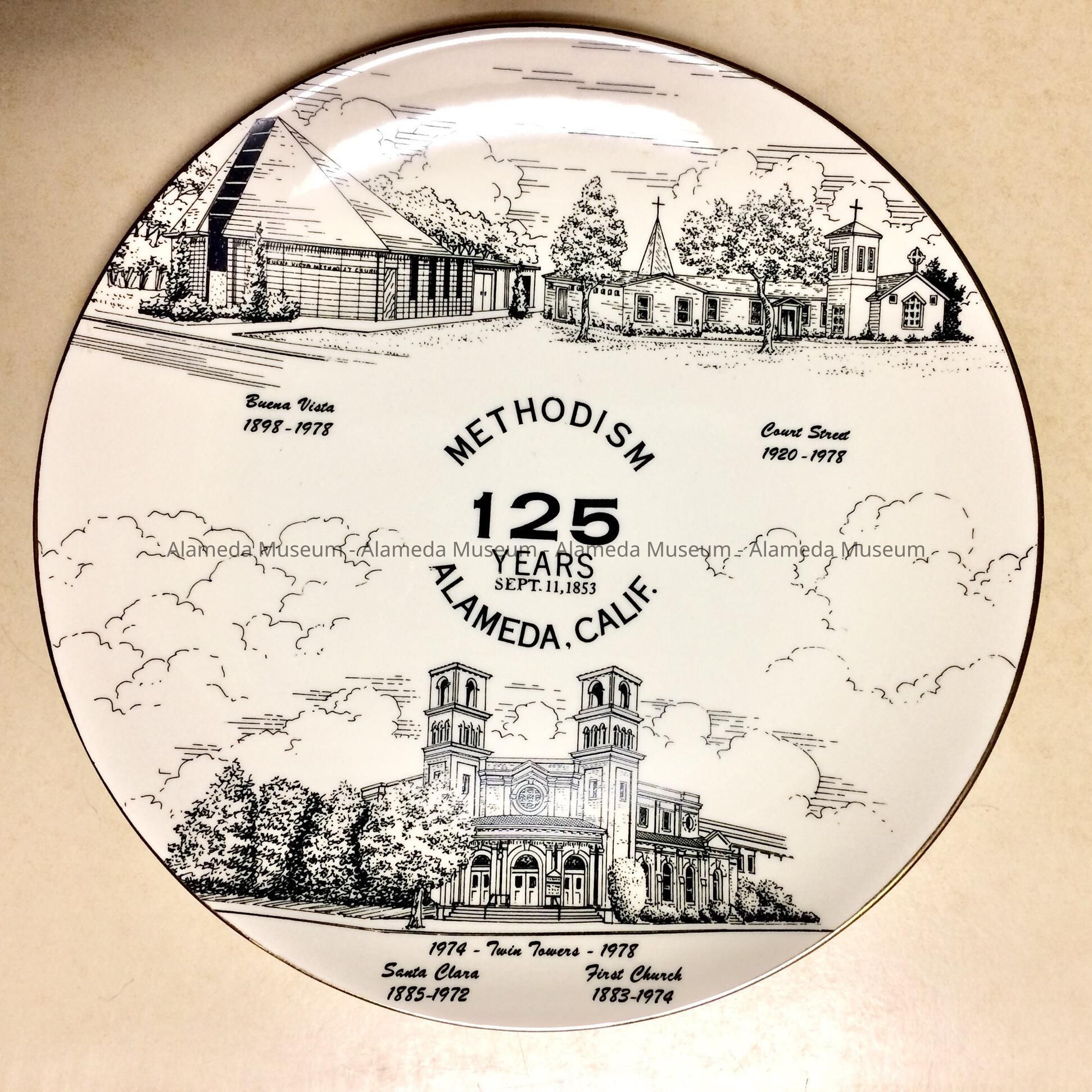DESCRIPTION: A SEMI-PORCELAIN PLATE IN OFF-WHITE-COLOR ILLUSTRATED WITH BLACK-AND-WHITE-COLORED TRANSFER DESIGNS. CENTER OF PLATE HAS "METHODISM, 125 YEARS, ALAMEDA, CALIF." PLATE WAS MANUFACTURED BY WORLD-WIDE ART STUDIOS, COVINGTON, TN.