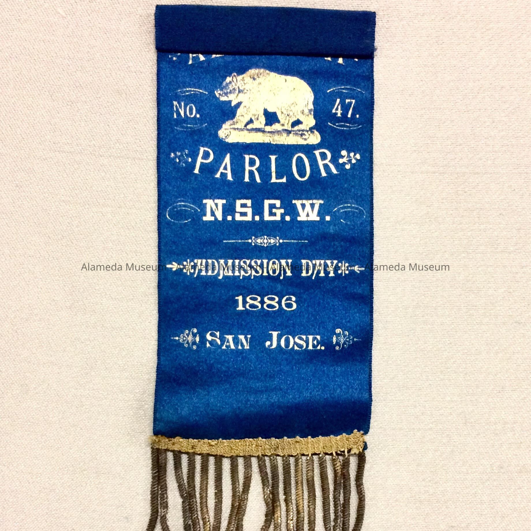 DESCRIPTION: A BLUE COLORED SILK RIBBON BADGE WITH PRINTED MESSAGE IN GOLD COLORED TYPE, "ALAMEDA NO. 47 PARLOR, NATIVE SONS OF THE GOLDEN WEST, ADMISSION DAY, 1886, SAN JOSE."