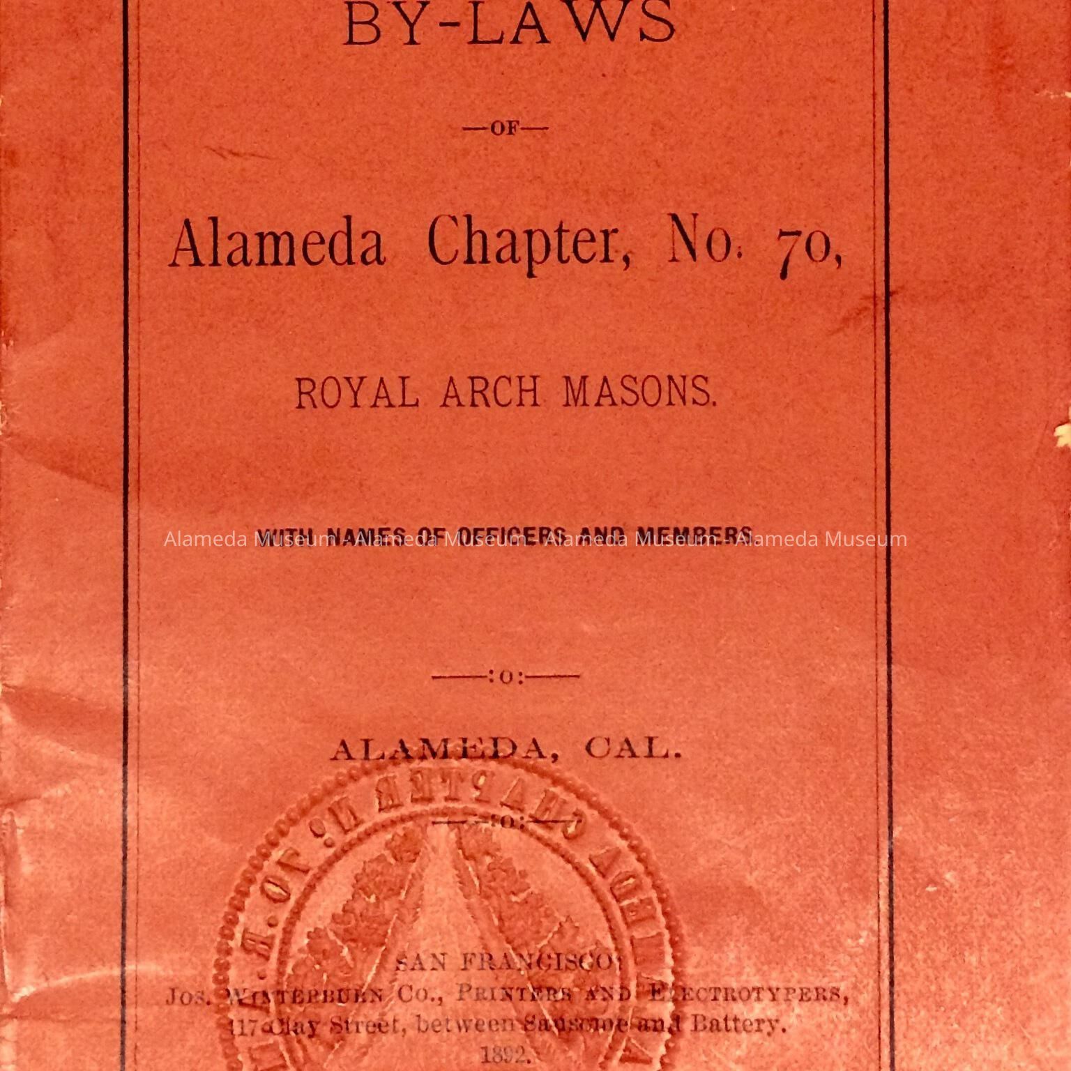 HISTORY OF OBJECT: BOOKLET CONTAINING BY-LAWS OF THE ALAMEDA CHAPTER NO. 70, ROYAL ARCH MASONS. PRINTED IN 1892.