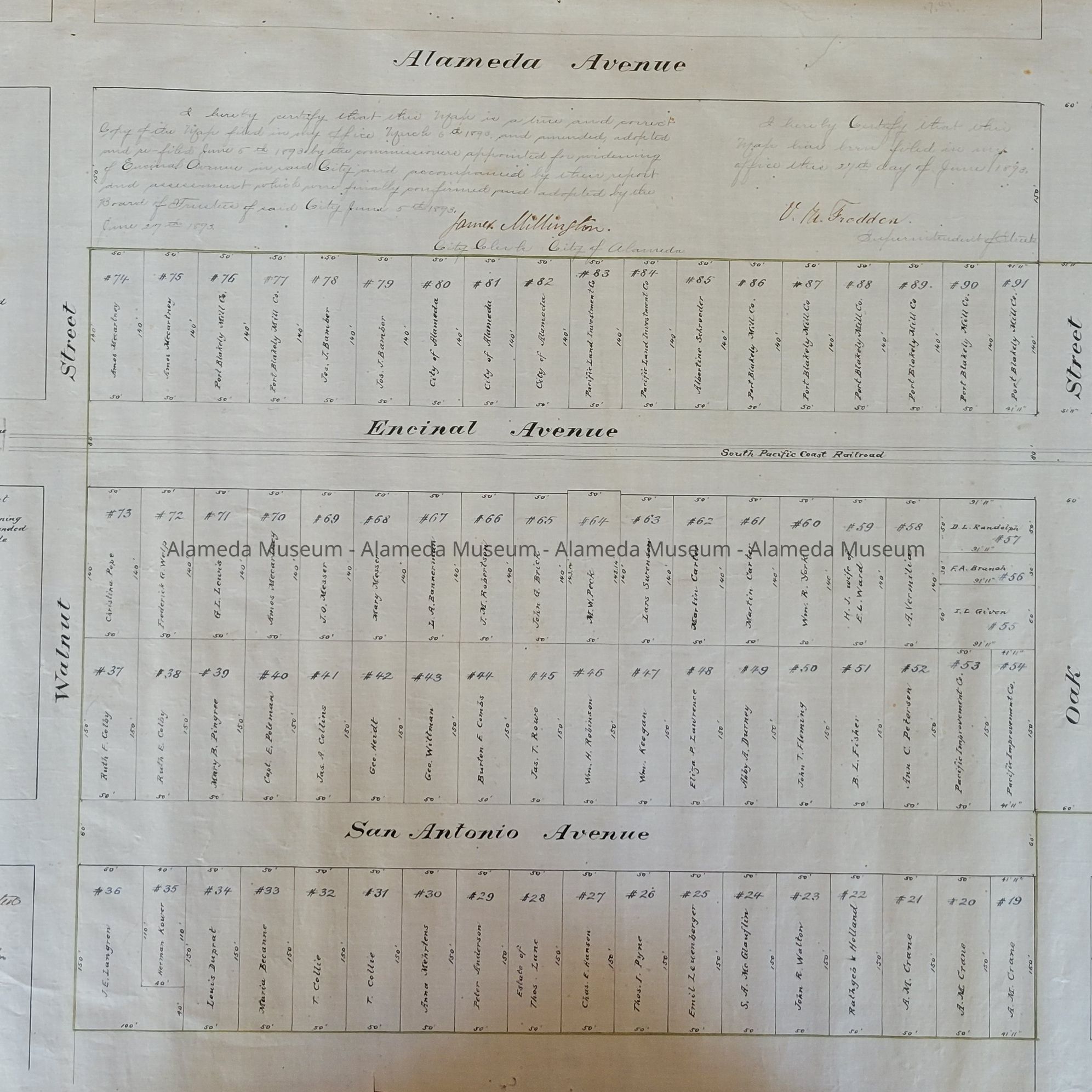 History of Object: In addition to the area to be widened, this map shows the individual property owners on both sides of Encinal Ave. and San Antonio Ave., between Walnut St. and Park St. "Filed March 6th 1893" is written on the map.