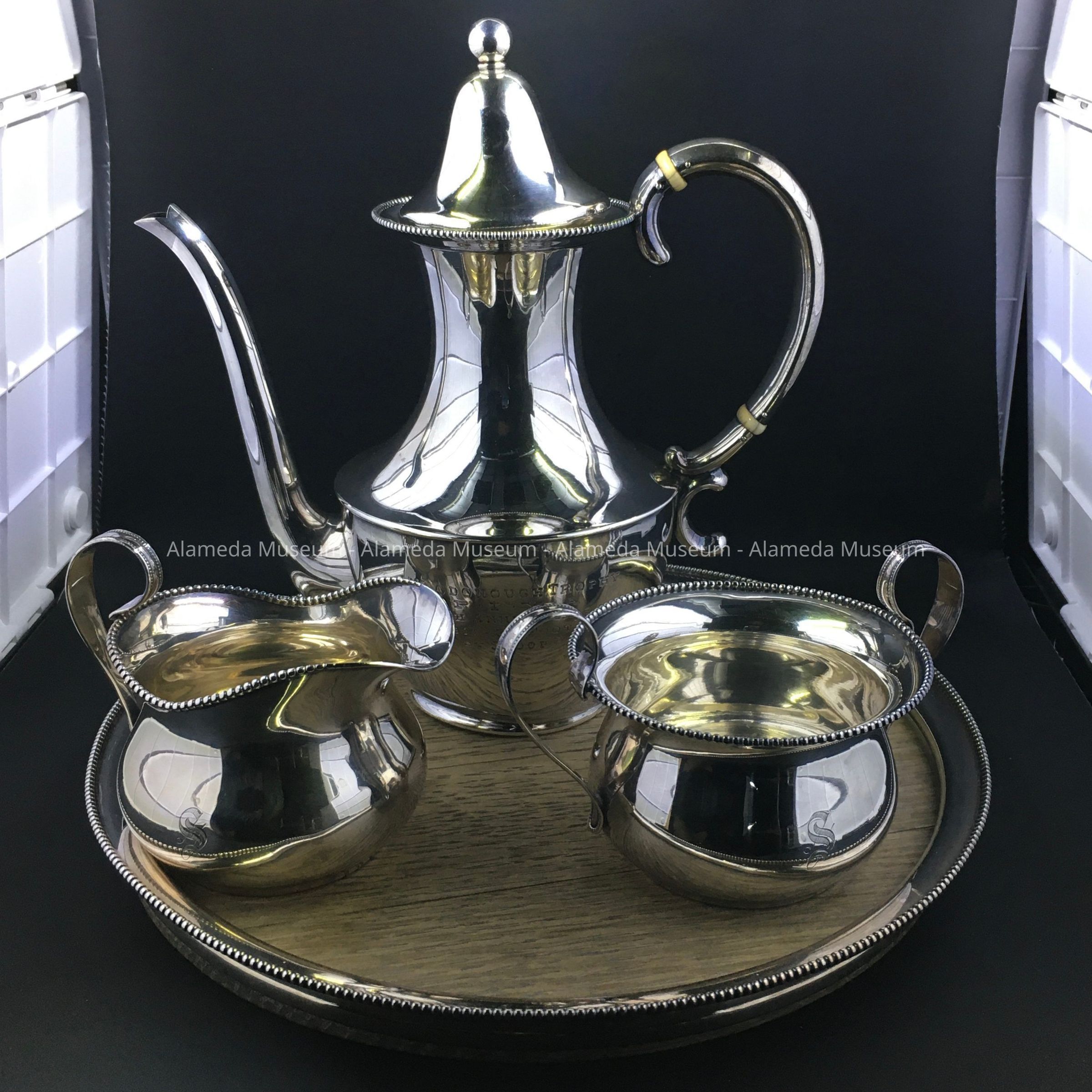 Description: Trophy in the form of a silver coffee, consisting of wood serving tray with silver rim, and silver coffee pot with lid, sugar bowl and creamer. Sugar bowl and creamer have an engraved gothic letter 'S'; coffee pot has engraved text: MacDonough Trophy, P.I.Y.A. Twelfth Annual Regatta, Sept 9, 1907, 36 ft class won by Sloop Presto.