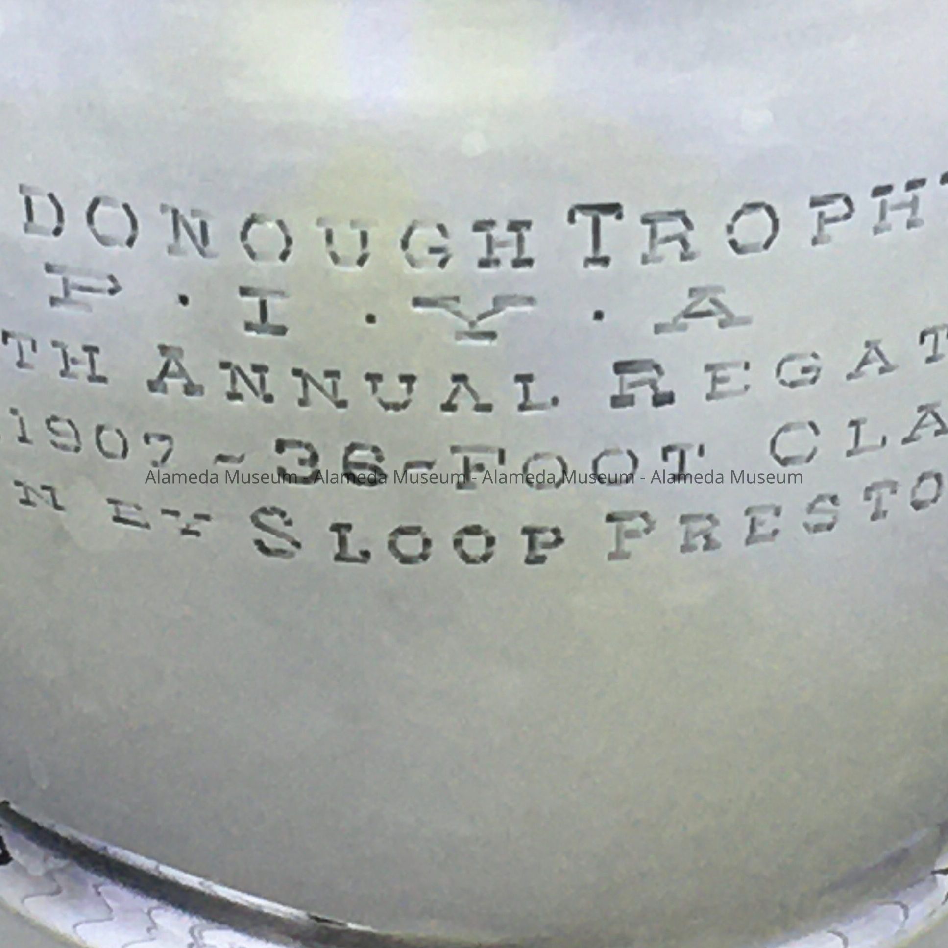 History of Object: trophy won by a wooden yacht built at the boatyard founded in San Francisco by William Isaac Stone; and passed on to Lester Stone, who moved the boatyard to Alameda around 1940. Donor is last descendant and a long-tine resident of Alameda.