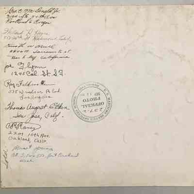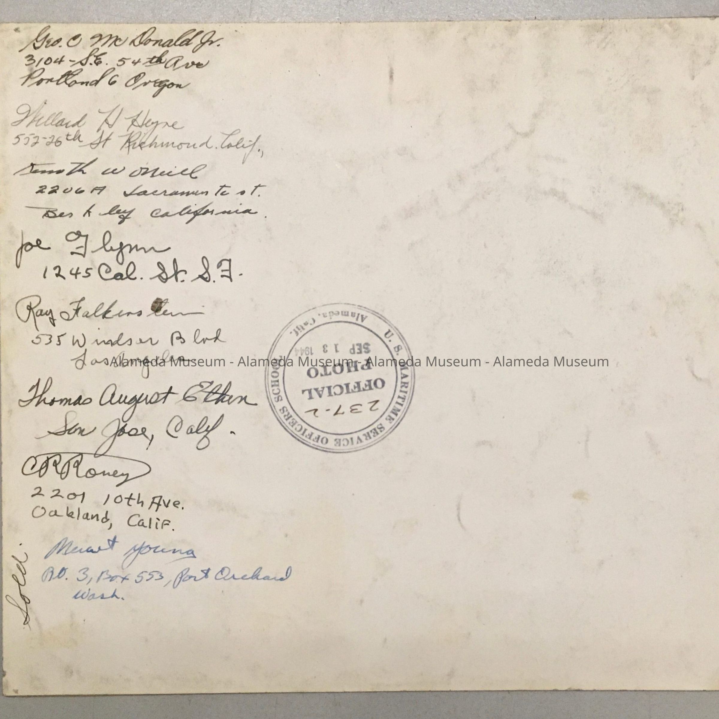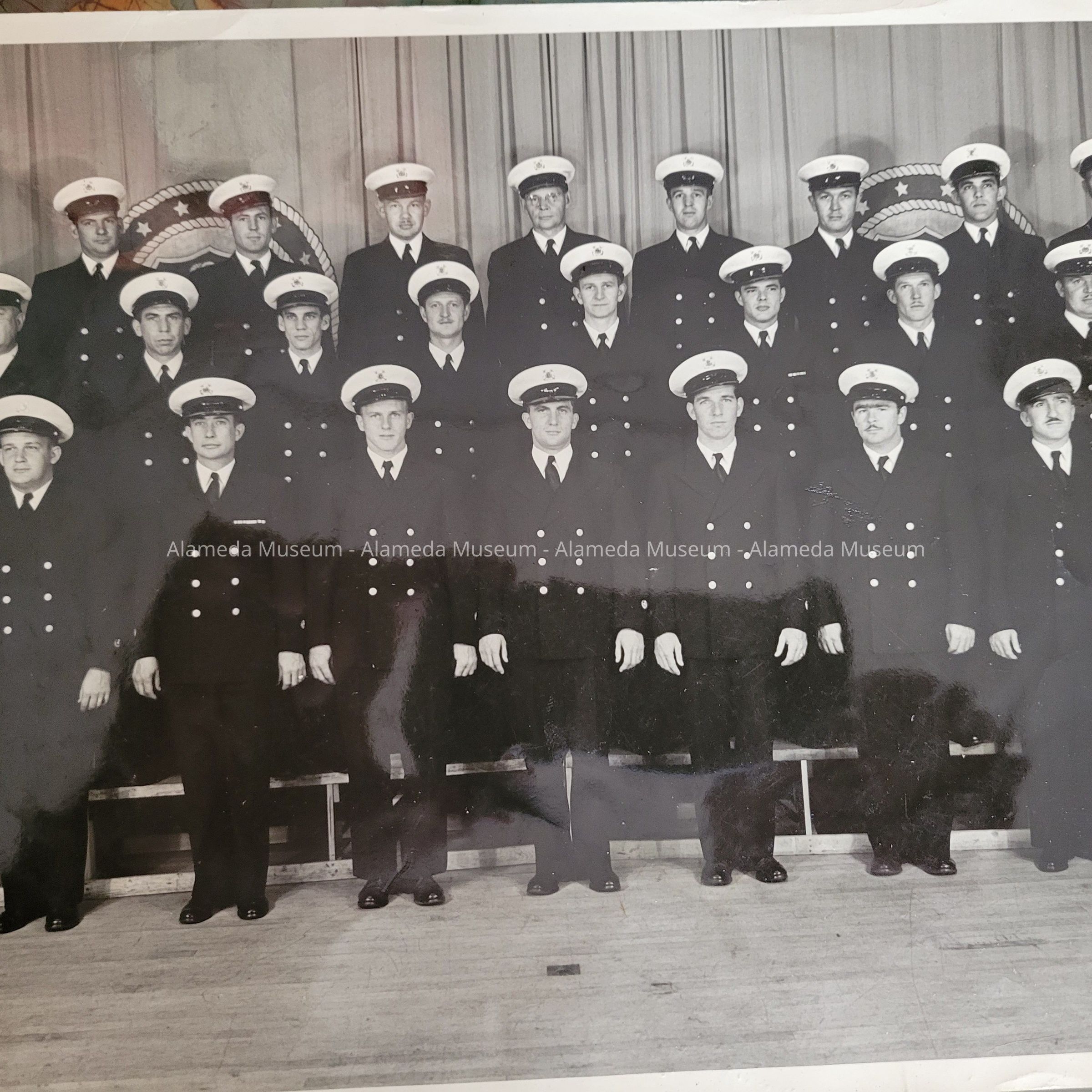 Photograph, black-and-white glossy print, in thin gold-painted metal frame with bllack velvet covered back. Date stamped 9/13/44 on back of photo over official photo U.S. Maritime Service Officers School stamp. Part of lower right hand corner missing. Back is also signed by eight people with their addresses. Geo. C McDonald Jr., Willard H Hyne, Kenneth W ONeal, Joe Flynn, Ray Falkensten, Thomas August Ethen, CR Roney, M Young.