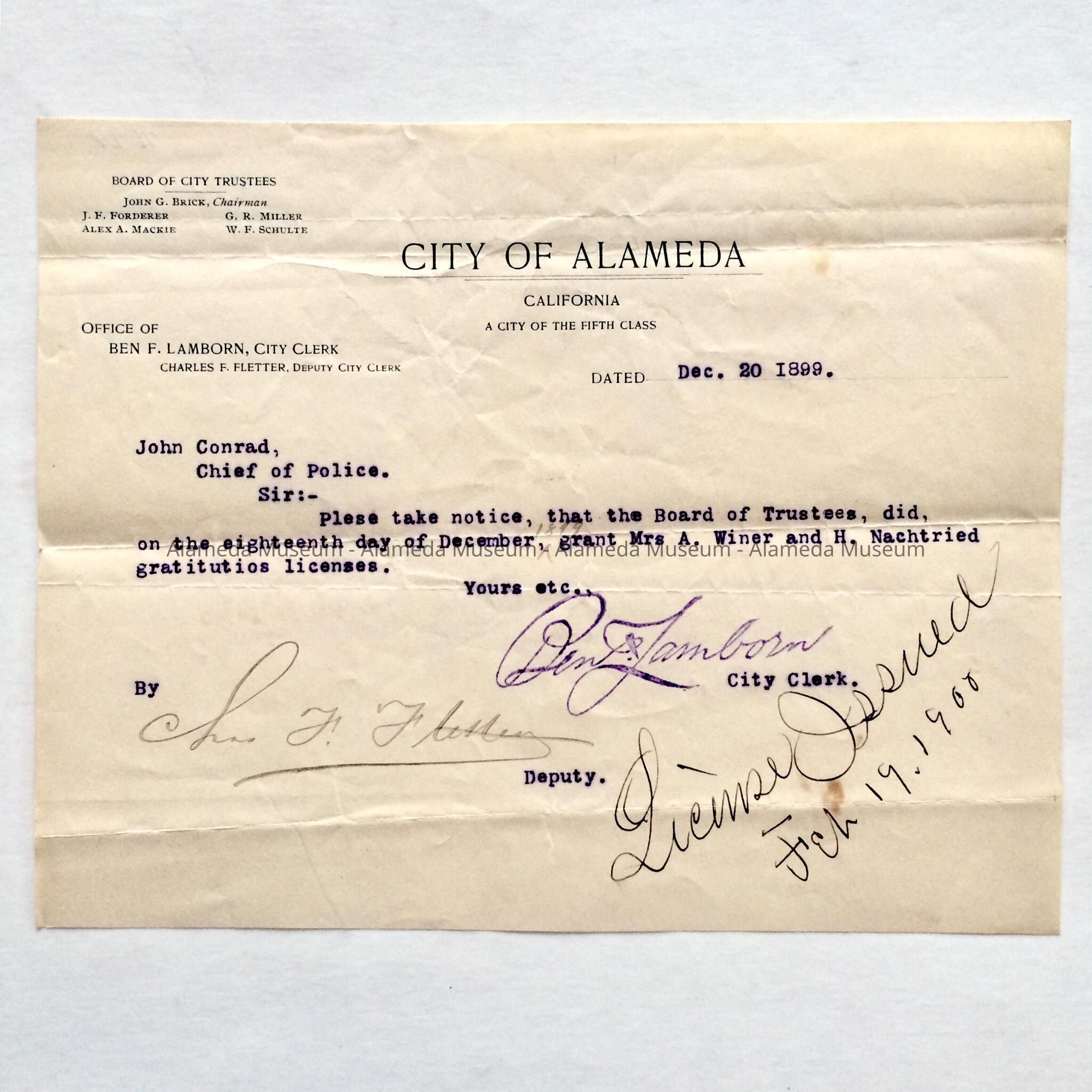 HISTORY OF OBJECT: THE STATIONERY IS FROM THE OFFICE OF BEN. F. LAMBORN, CITY CLERK, AND ADDRESSED TO JOHN CONRAD, CHIEF OF POLICE. GRANTING TWO PEOPLE GRATUITOUS LICENSES TO PEDDLE ON THE STREETS OF ALAMEDA, SIGNED BY CHARLES F. FLETTER, DEPUTY CITY CLERK,