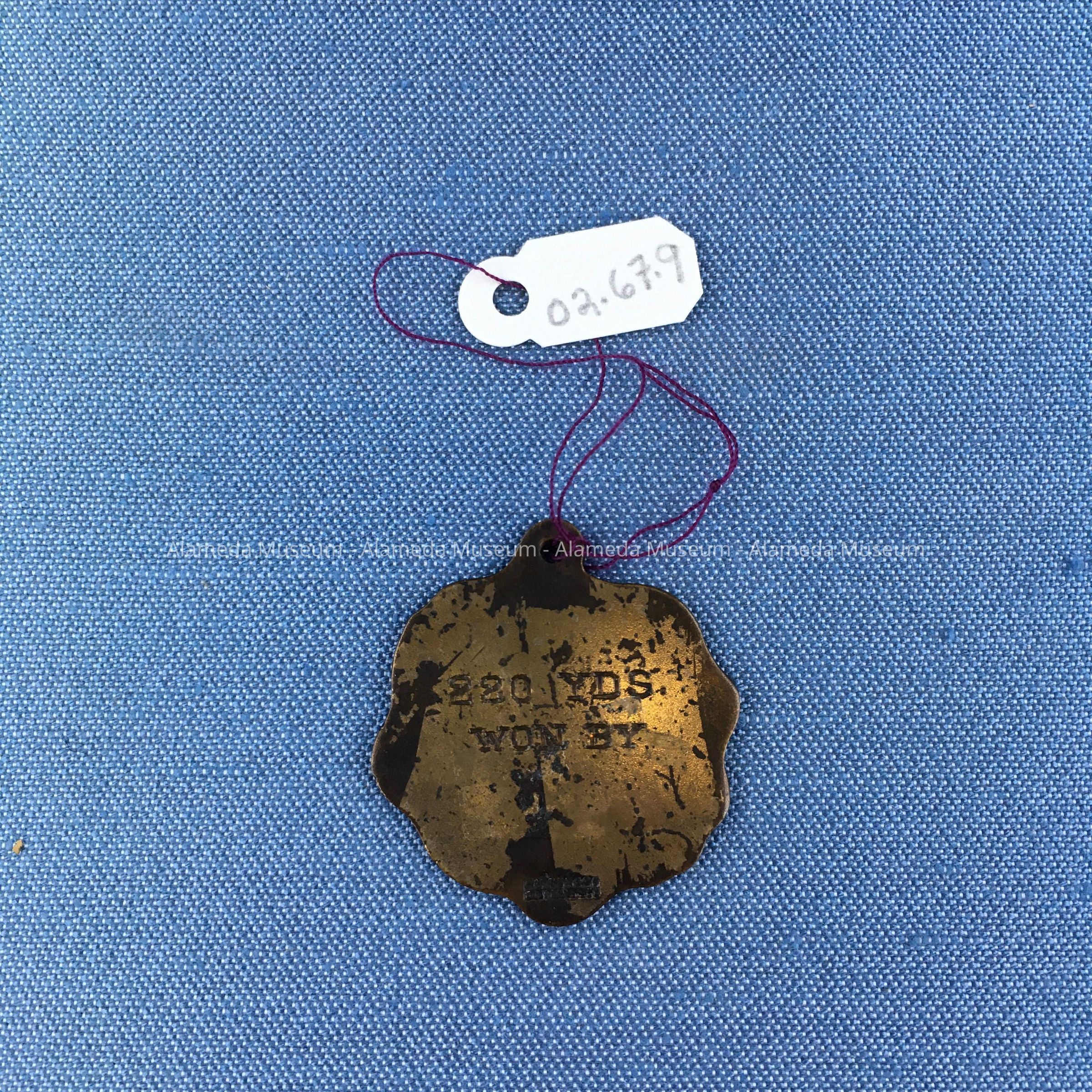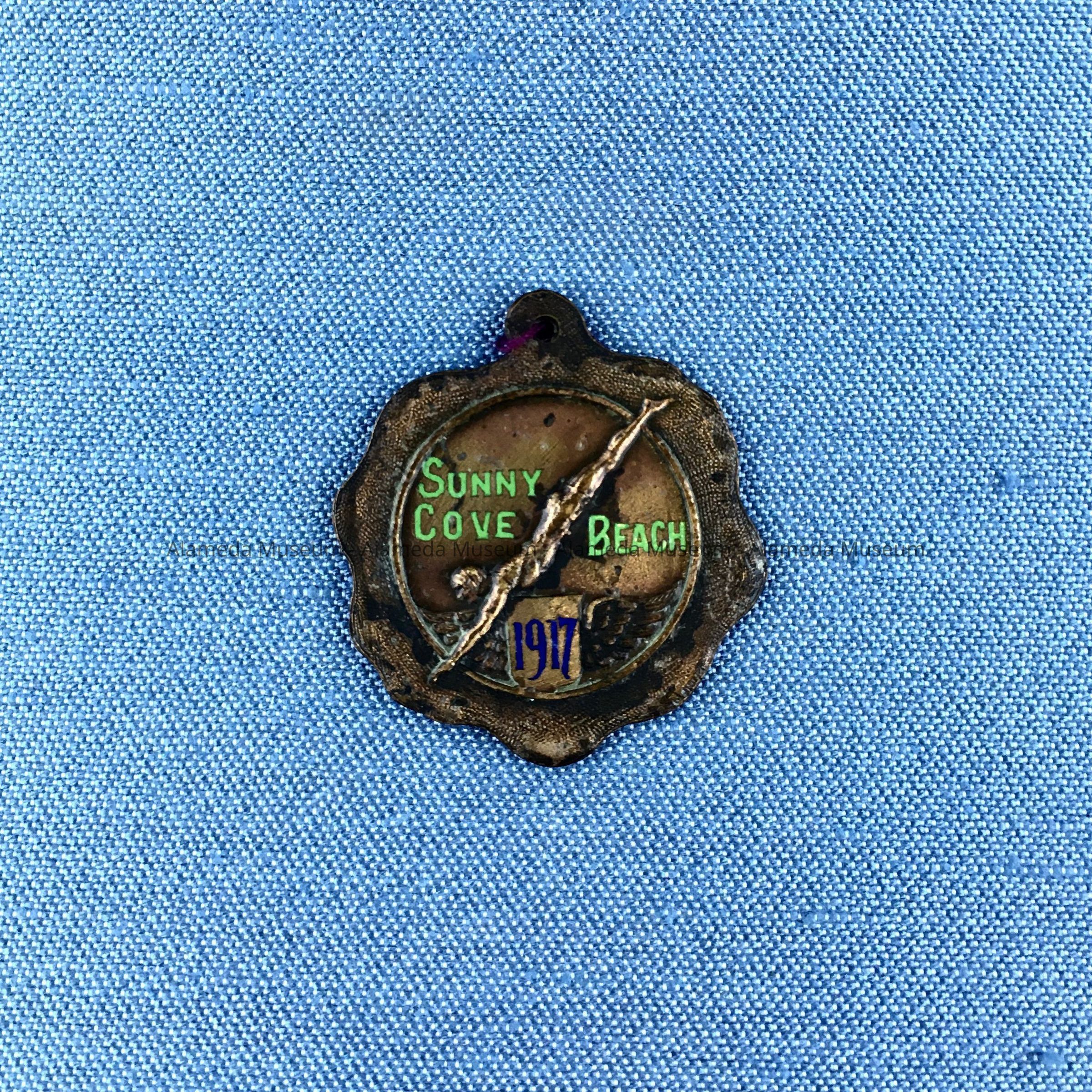 MEDAL WITH SCALLOPED EDGE AND CENTRAL MOTIF OF DIVING SWIMMER AND EMBOSSED CAPTION, "SUNNY COVE BEACH," IN GREEN-COLORED ENAMEL ON A COPPER BACKGROUND. REVERSE SIDE IS ENGRAVED, "220 YARDS. WON BY" (NO NAME).