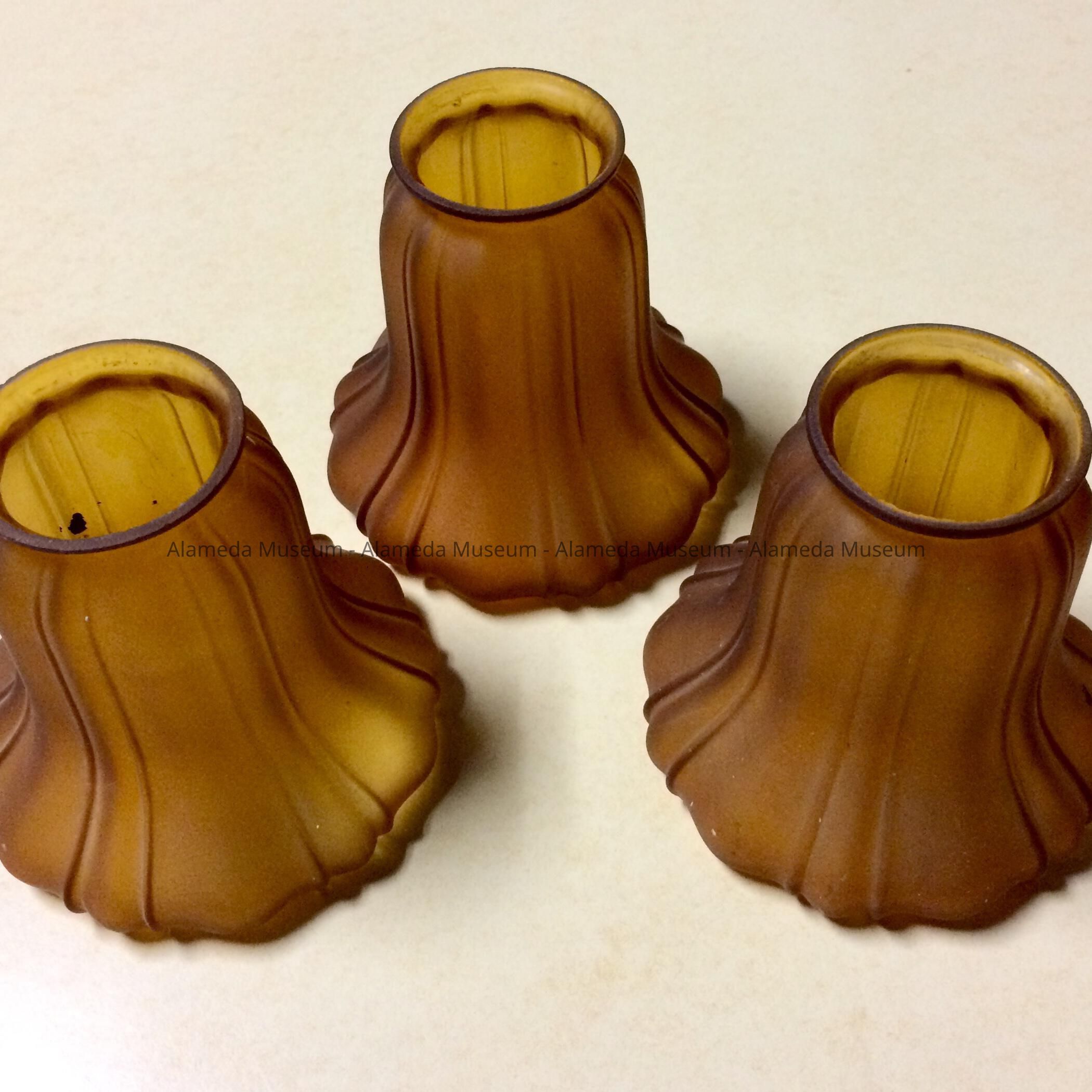 Description: Three shades from an electric light fixture that are bell shaped with a pattern of vertical ribs resembling flower petals in a deep amber color with an exterior of satin frosted finish. Unsigned.