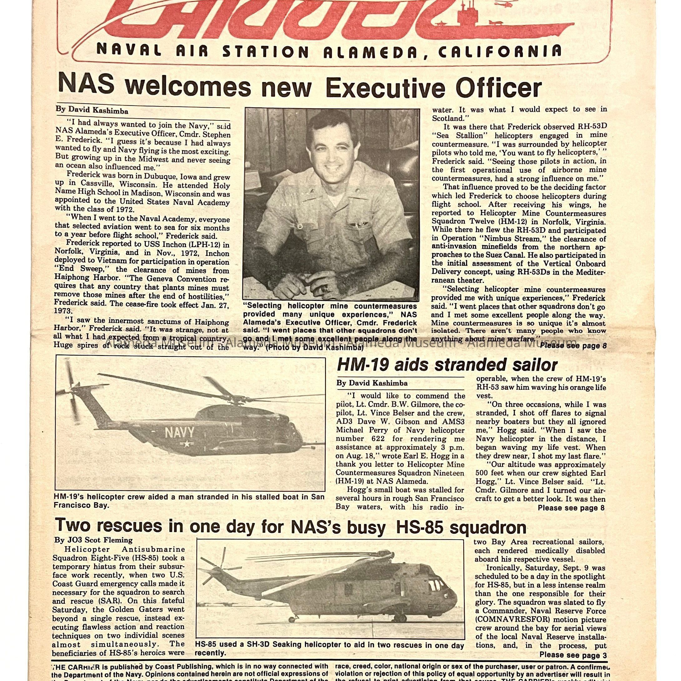 History of Object: Editions of the NAS, Alameda newsletter. The September 29, 1989 edition has a front-page article with interview of then new Executive Officer, Cmdr. Stephen Frederick.
