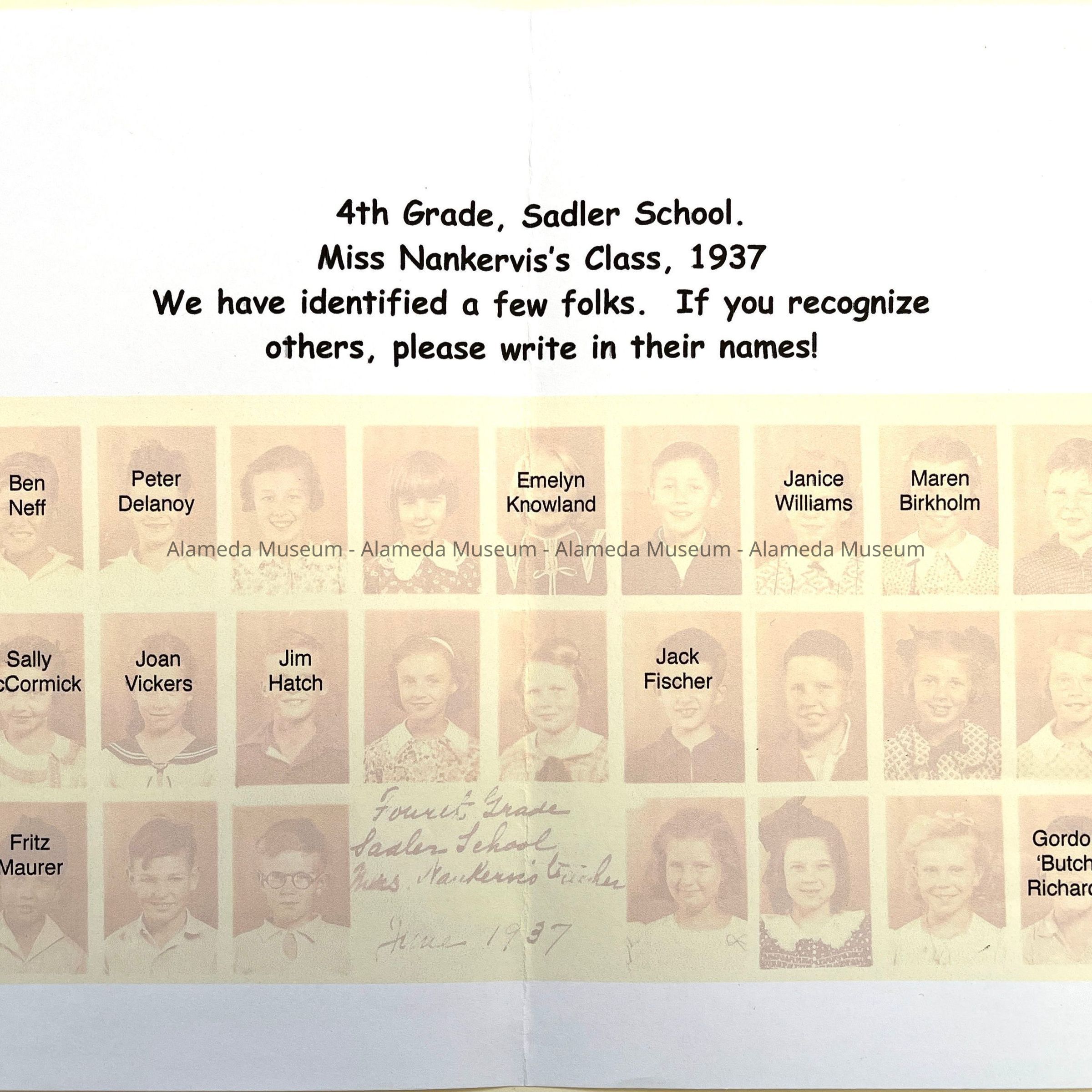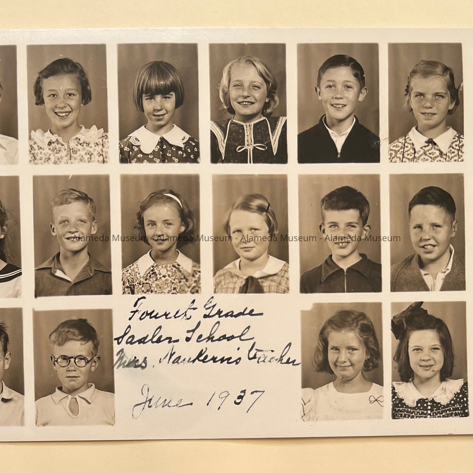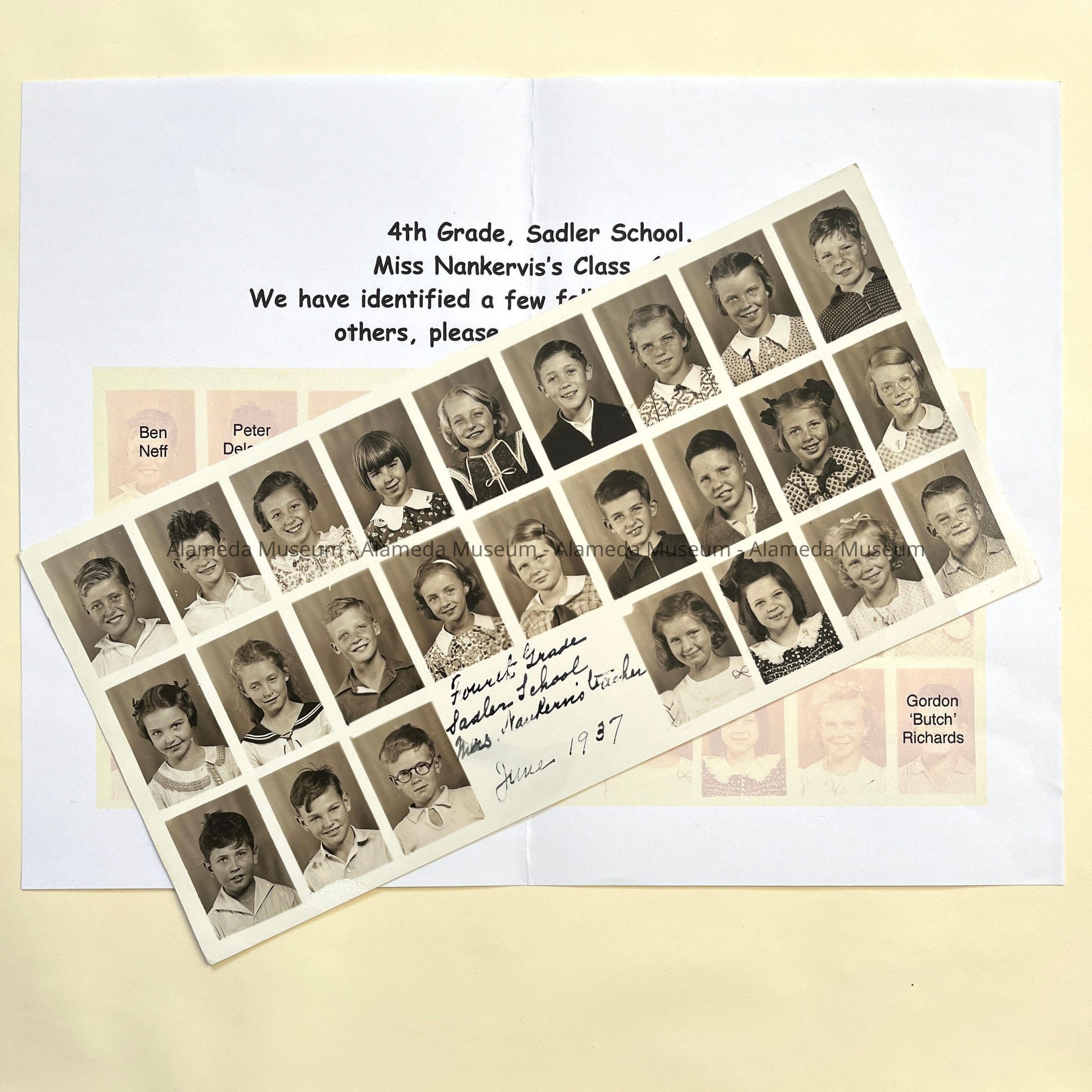 Description: composite photograph of individual sepia tinted photographs of children, with handwritten: ‘Fourth Grade / Sadler School / Mrs. Nankervis Teacher’.