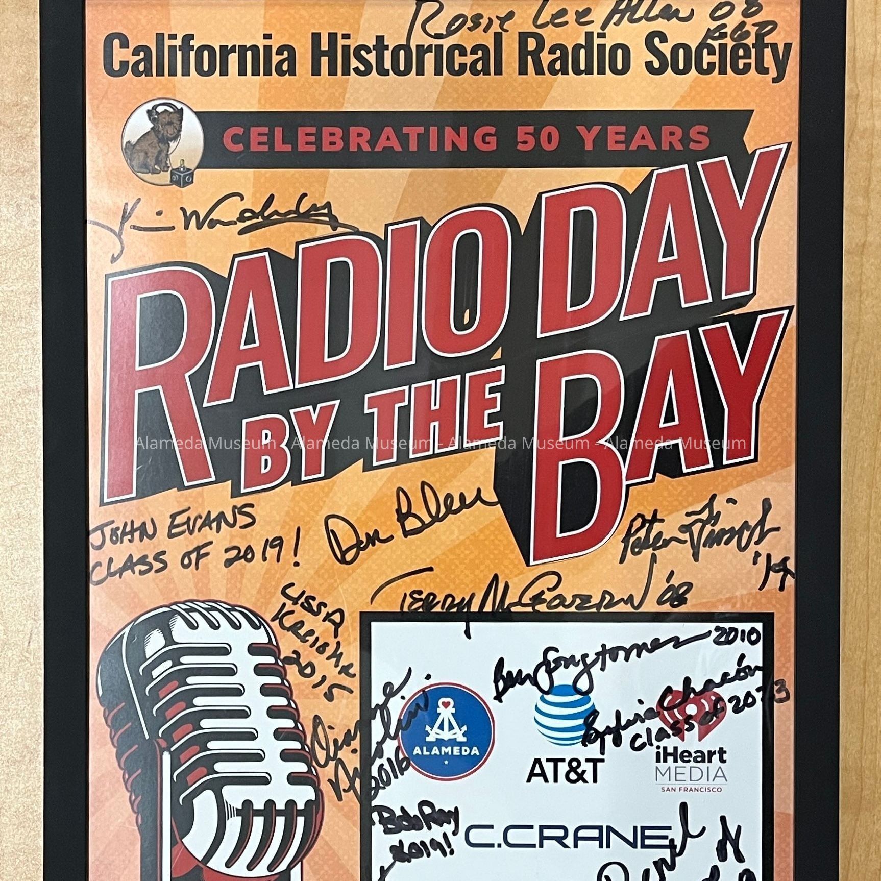 Description: Poster, signed by multiple people, with drawing of a microphone on an orange-yellow background, with heading ii black and red type: 'California Historical Radio Society / Celebrating 50 years / Radio Day By the Bay', with white area with 'Thank you to our partners'. In contemporary black plastic frame with thin plastic protection layer.