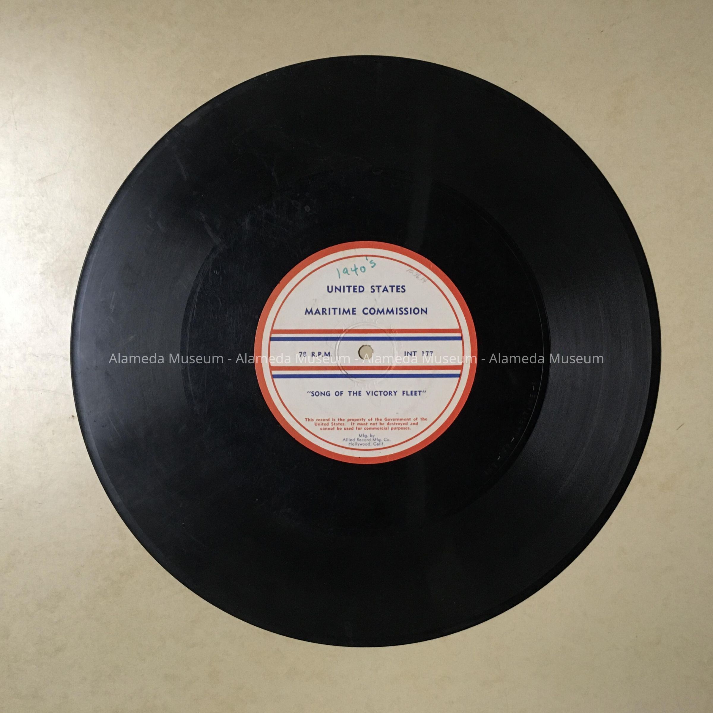 HISTORY OF OBJECT: A PHONOGRAPH RECORD PRODUCED BY THE ALLIED PHOTOGRAPHIC AND RECORD MANUFACTURING COMPANY, RADIO DISC, HOLLYWOOD, CAL. RECORD PLAYS "SONG OF THE VICTORY FLEET," AND PERFORMED BY MEMBERS OF THE U.S. MARITIME SCHOOL.