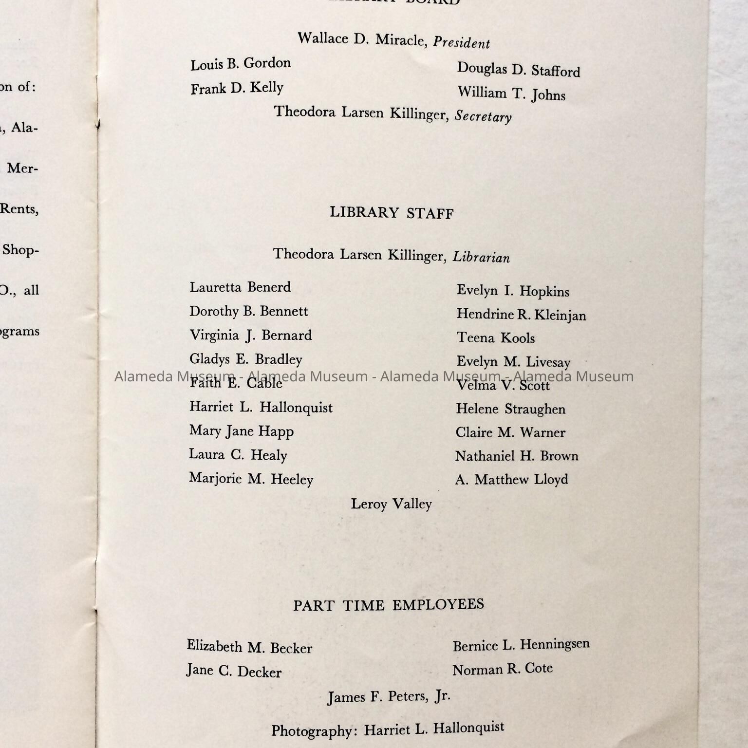History: 78th Annual Report, Alameda Free Library for 1957. Report includes statistics, summary and a listing of library staff, etc.