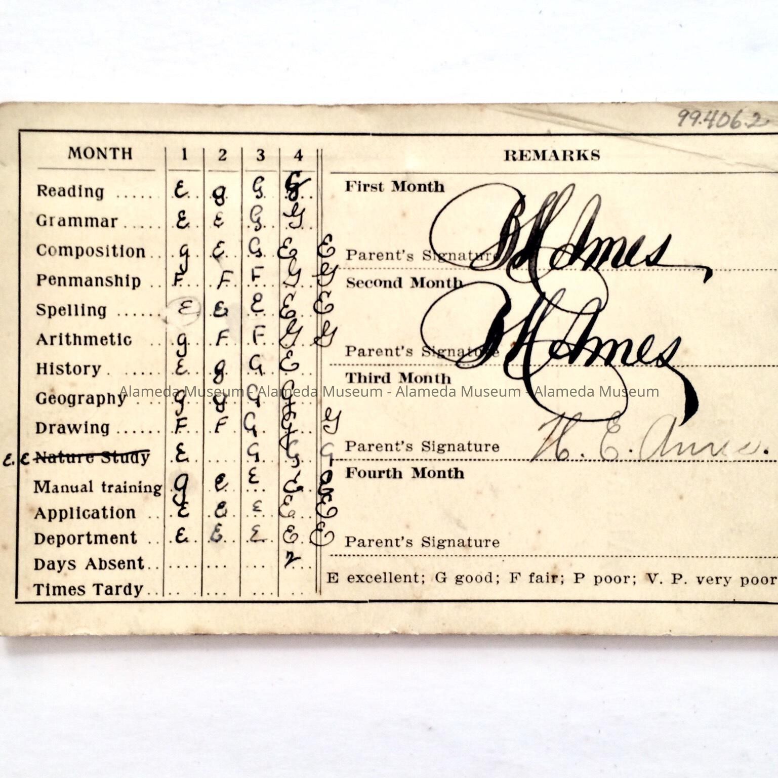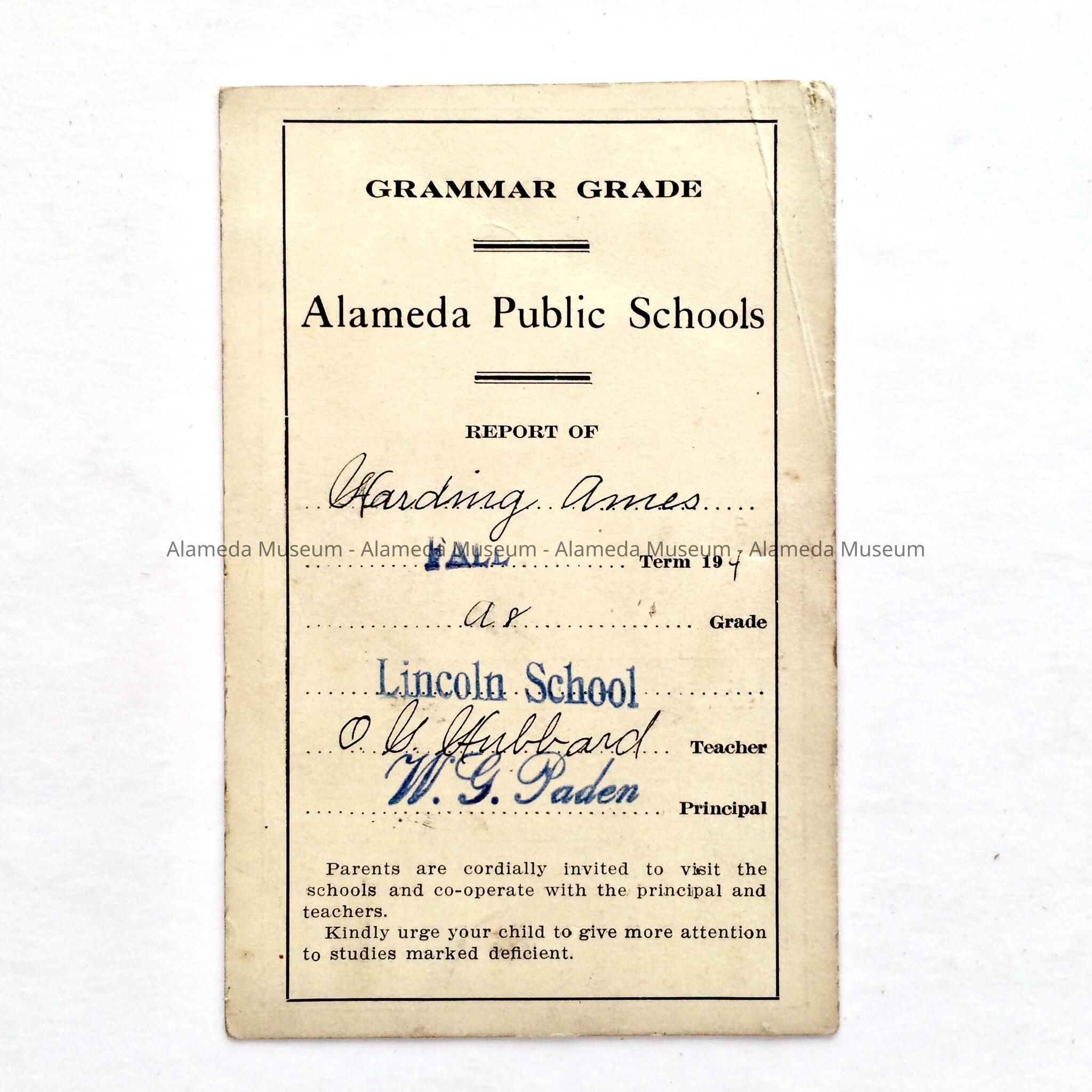 Description: Report card form printed on heavy stock paper. Card had a bold-printed caption, "Alameda Public Schools". Information blanks filled out in ink.