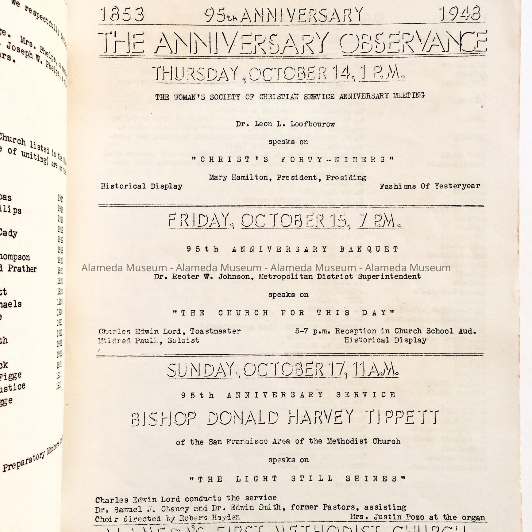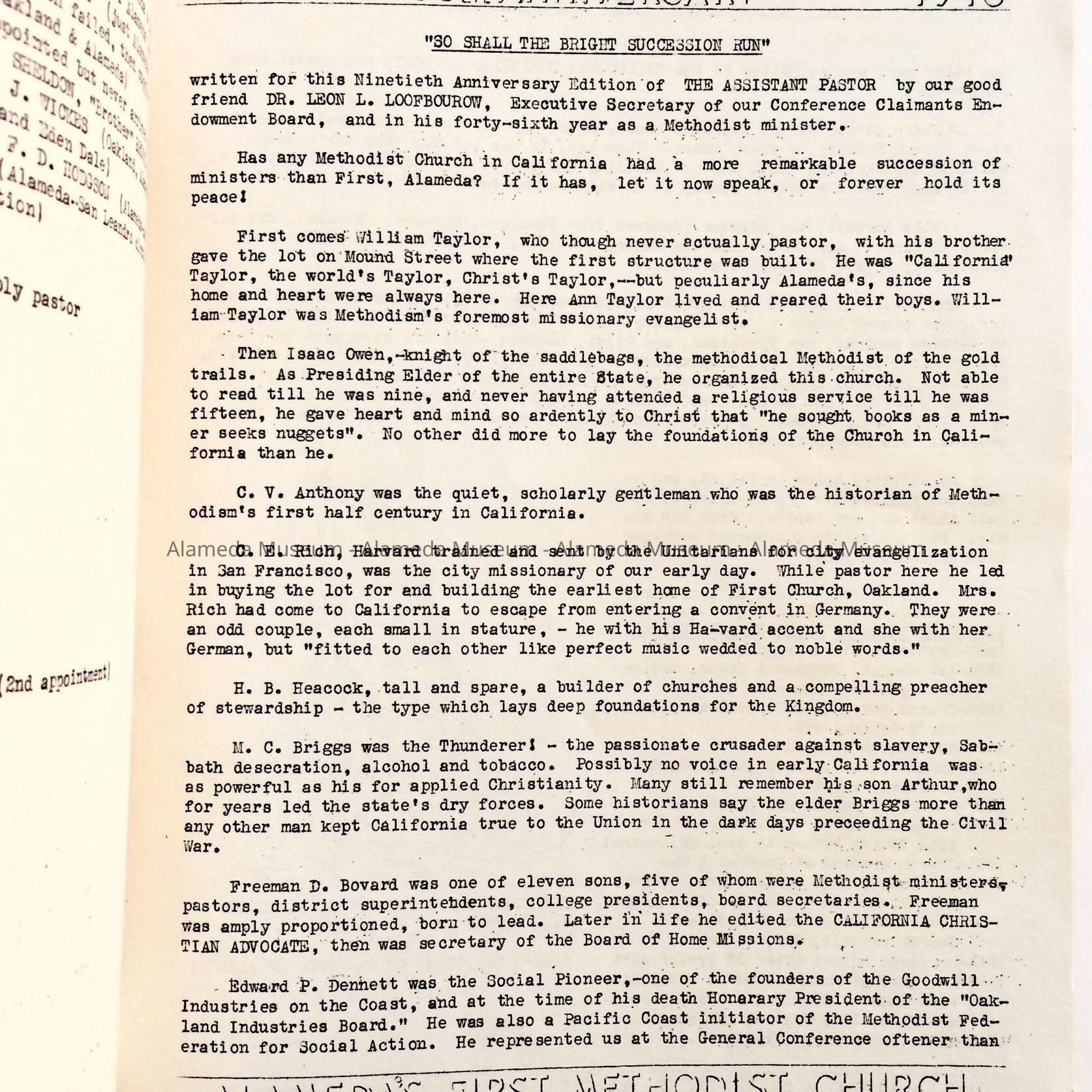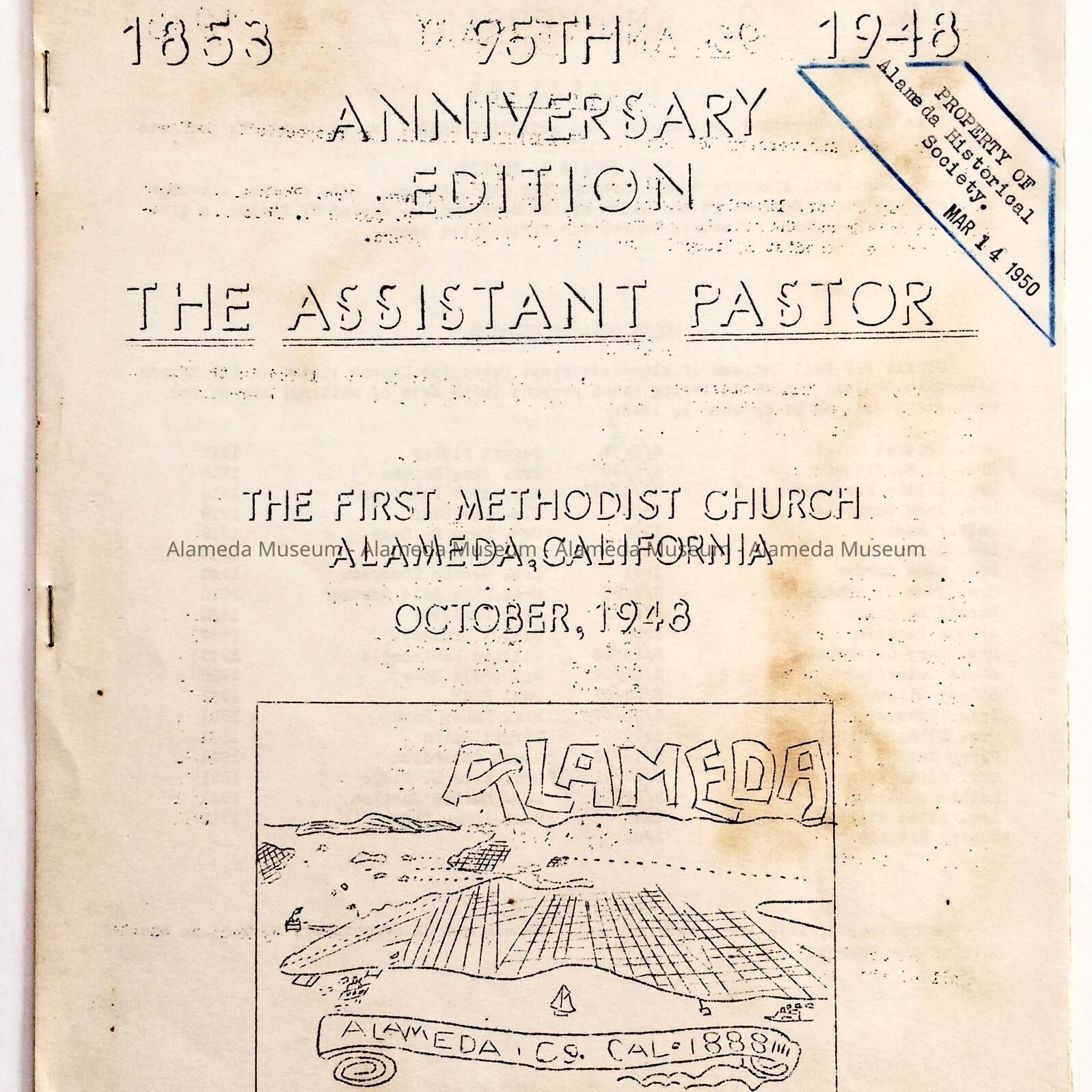 SPECIAL EDITION OF THE PUBLICATION ENTITLED, "THE ASSISTANT PASTOR," AND ISSUED BY THE FIRST METHODIST CHURCH, ALAMEDA, OCTOBER 1948. EDITION INCLUDES A LIST OF PAST MINISTERS AND A BRIEF PARISH HISTORY. IT ALSO INCLUDES A LIST OF EVENTS THAT OCCURRED DURING THE ANNIVERSARY OF THE CHURCH. THIS PAMPHLET IS POSSIBLY ONE OF THE EARLIEST DOCUMENTED OBJECTS COLLECTED BY THE ALAMEDA HISTORICAL SOCIETY, AS IT IS DATED MARCH 14, 1950. IT WAS NOT OFFICIALLY CATALOGED BY SOCIETY MEMBERS AT THAT TIME.