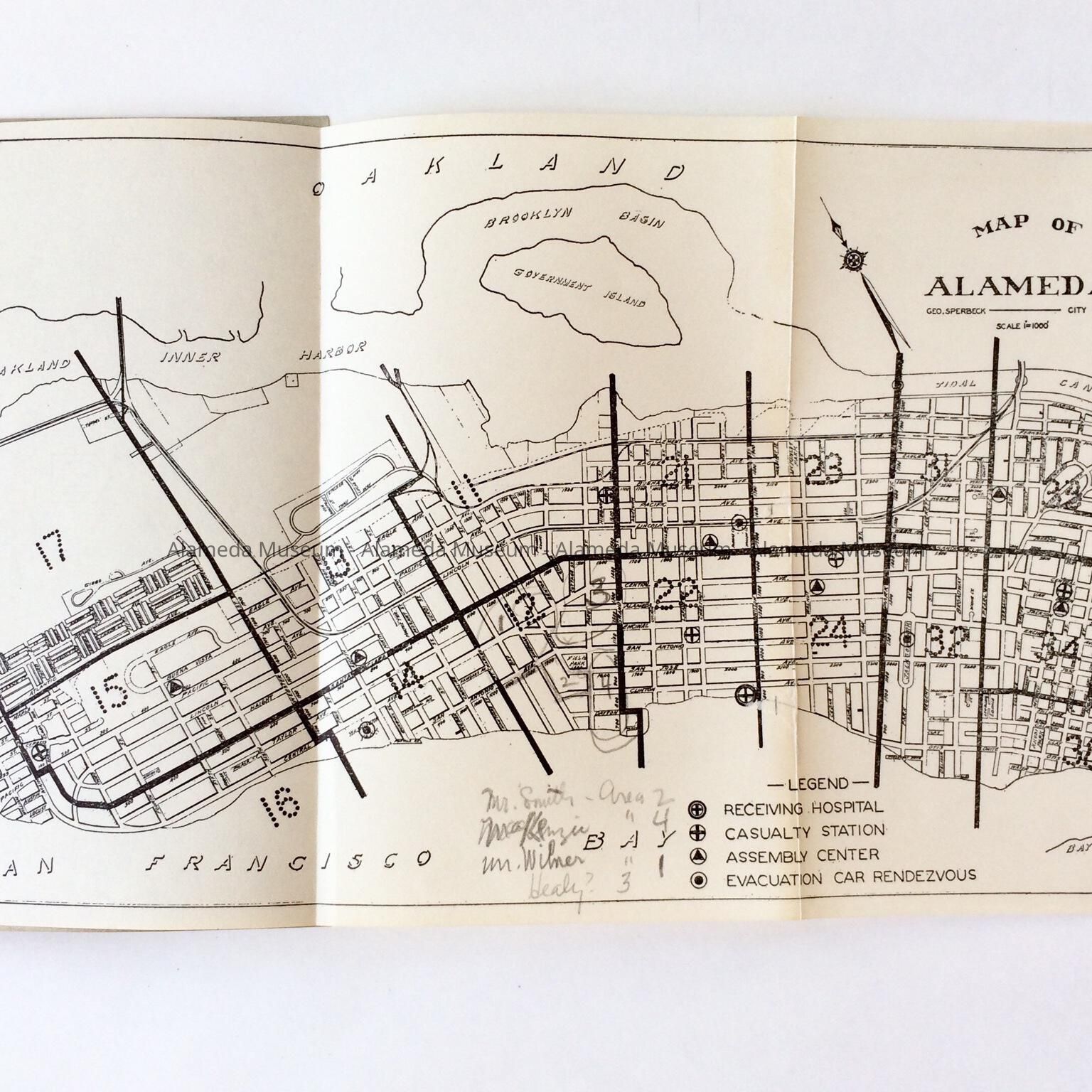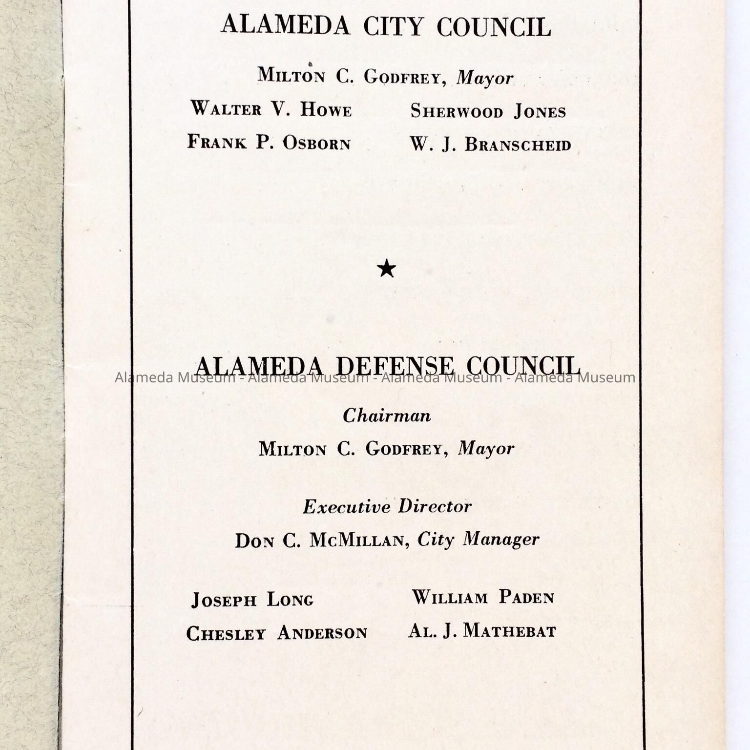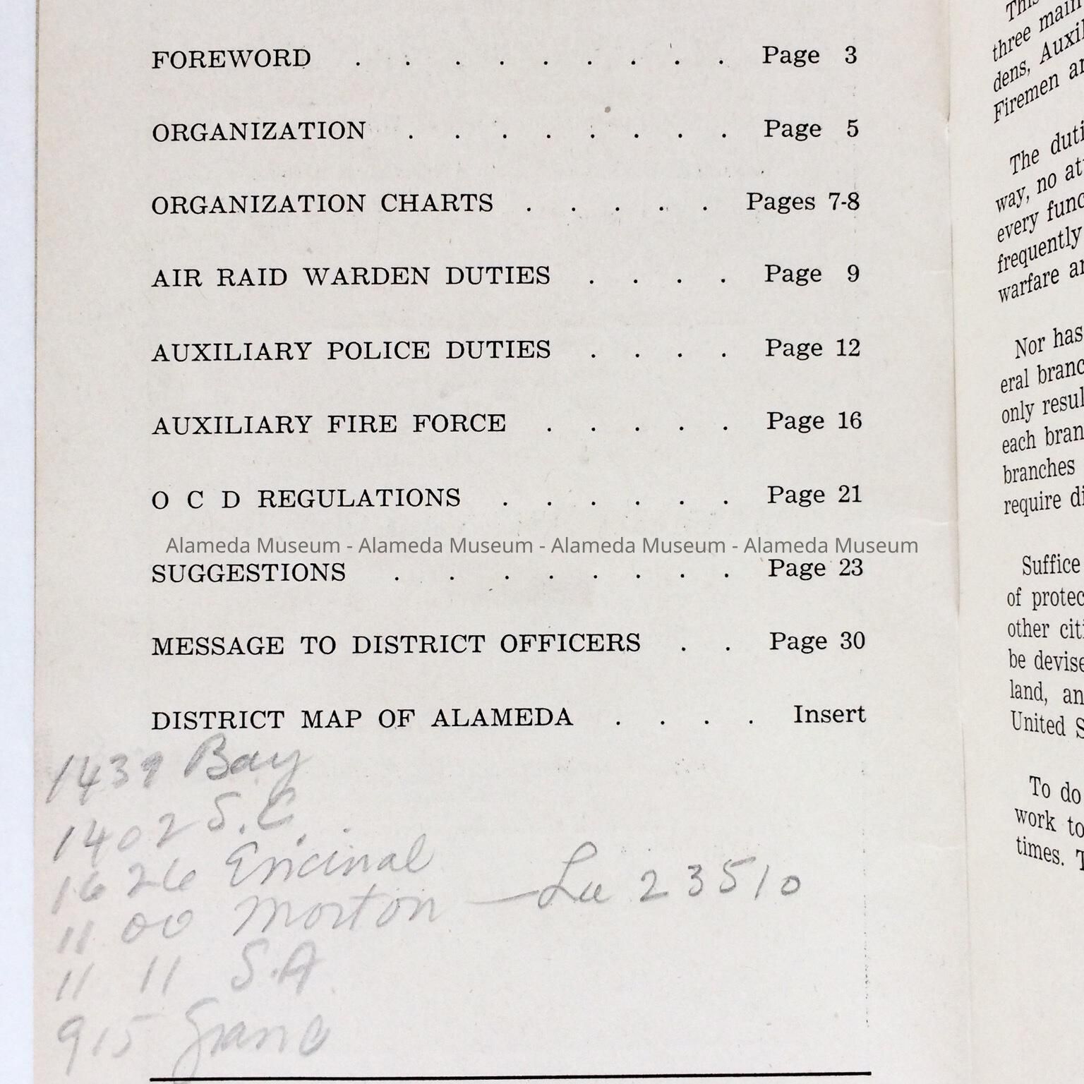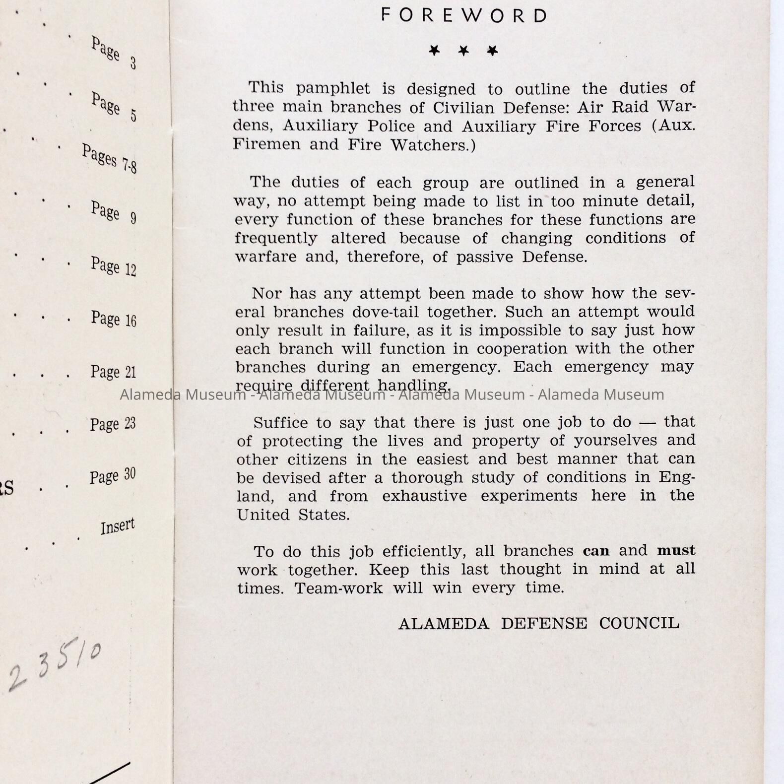 History of Object: Booklet issued by the Alameda Defense Council to outline the specific duties of the Air Raid Warden, Auxiliary Fireman, etc., volunteer services during World War 2., Alameda.