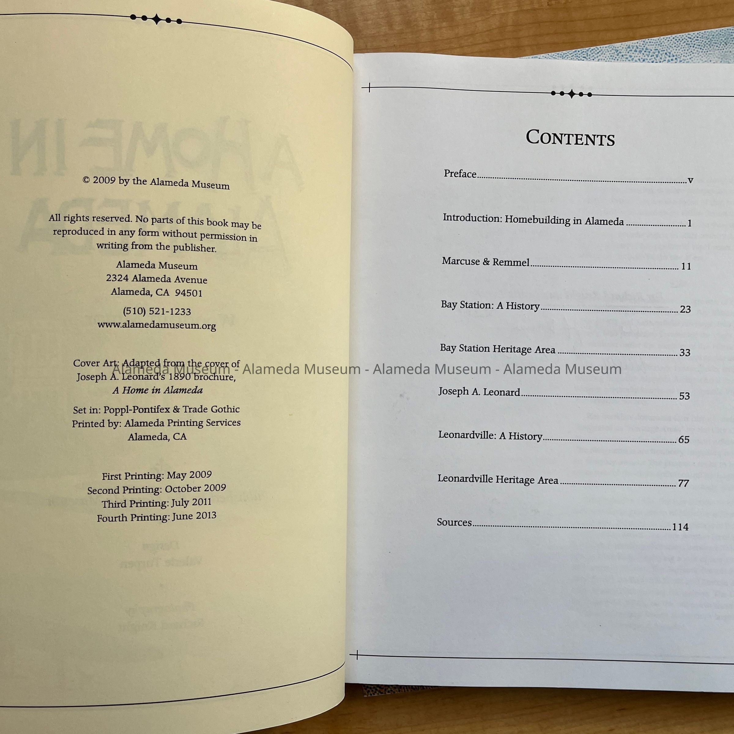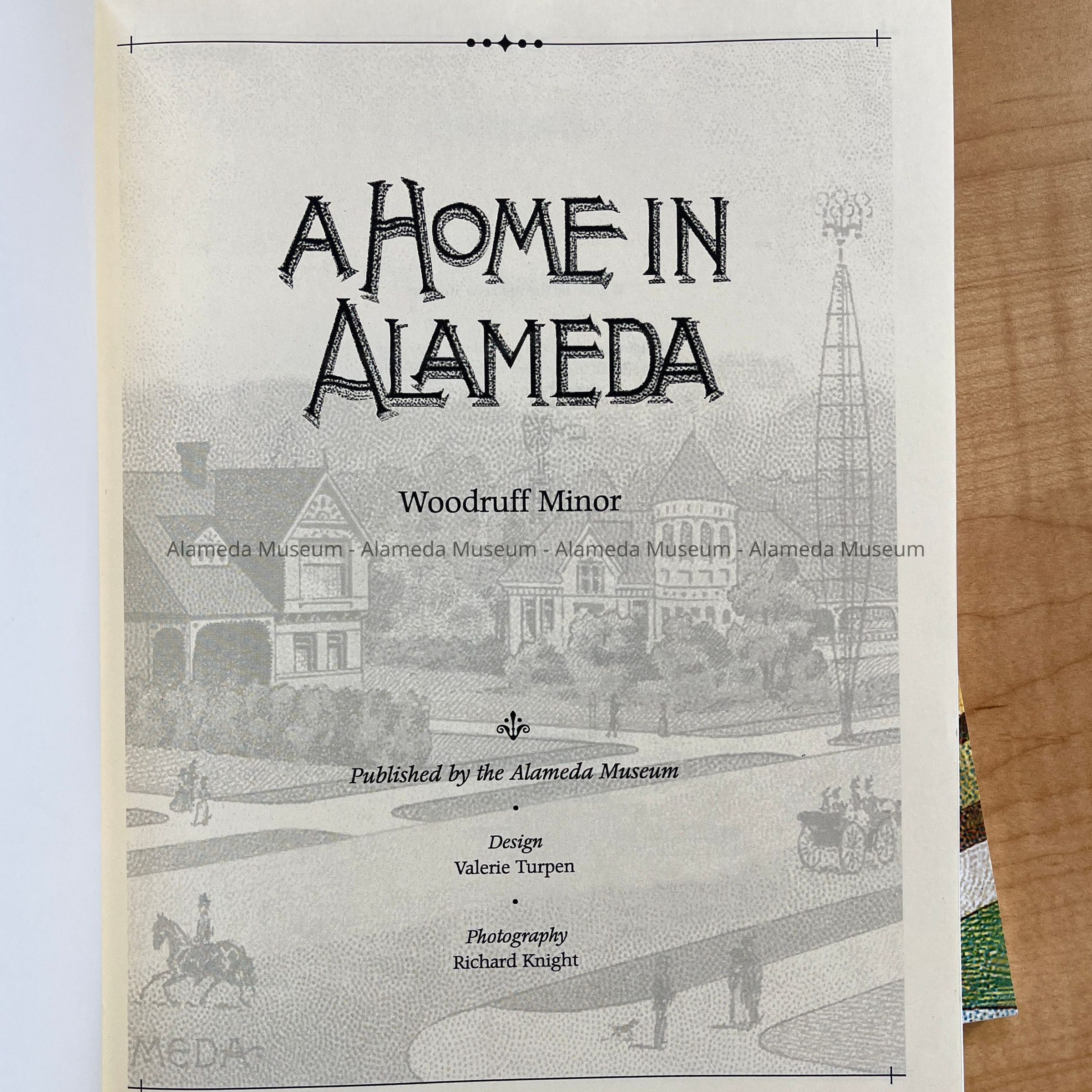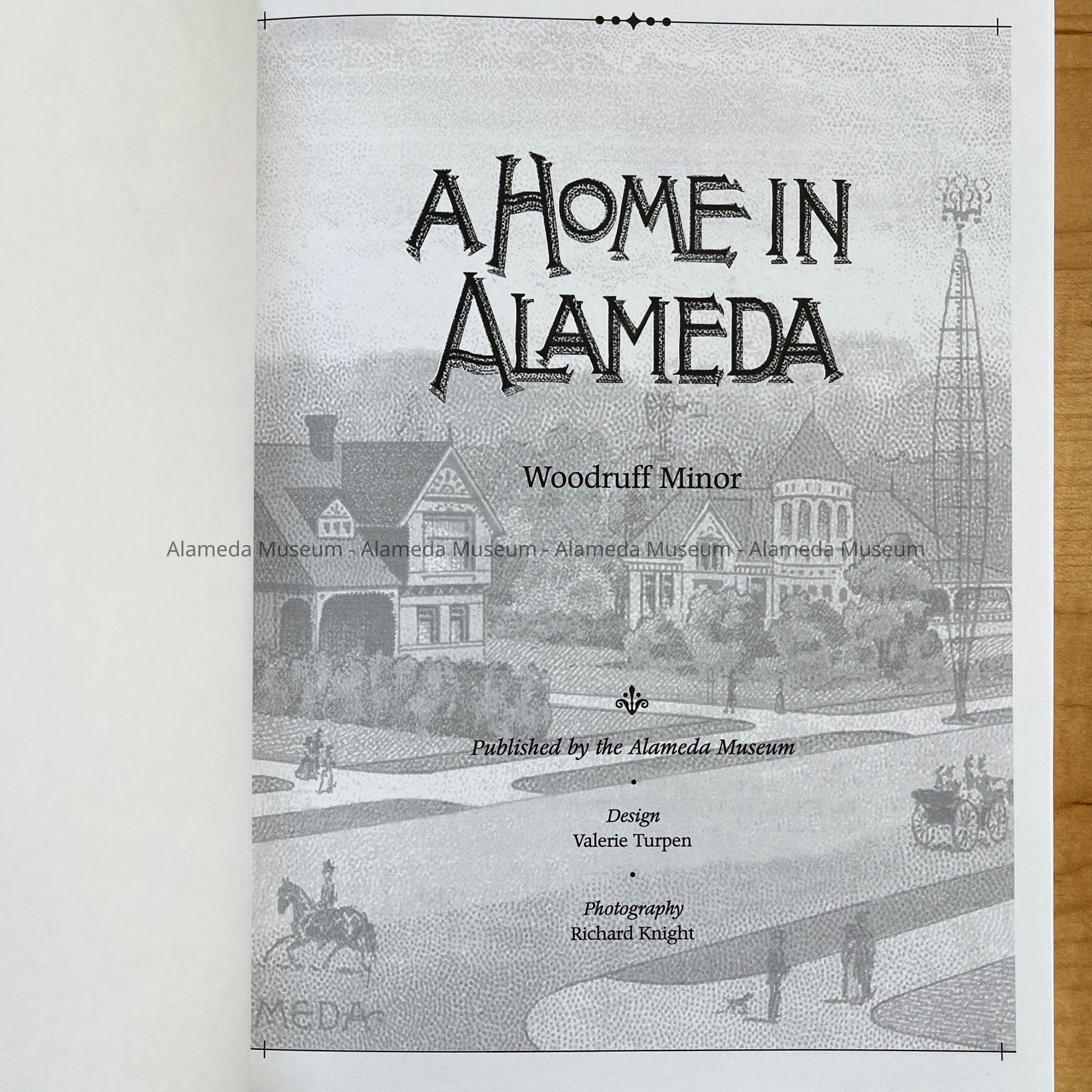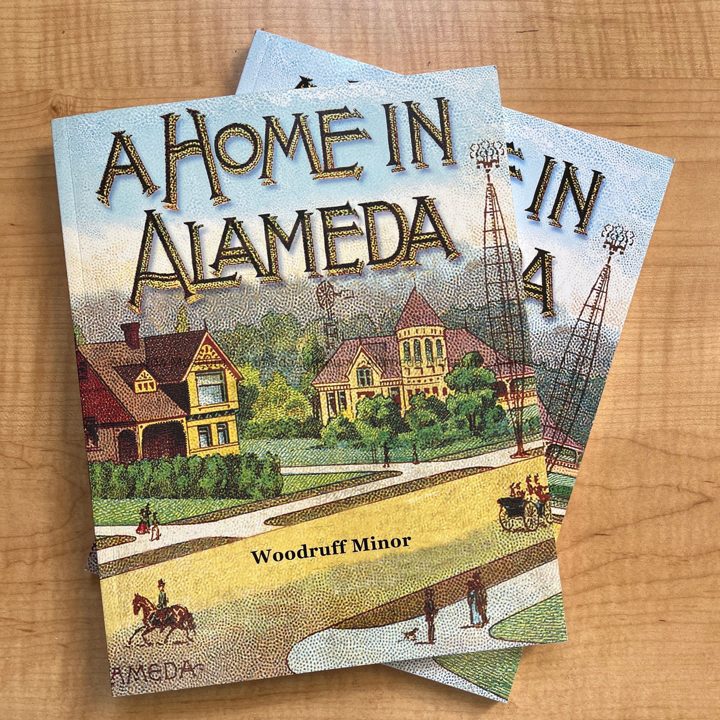 Description: 2 editions of a paperback book, 115 pages, with cover featuring a reprint of a dotted image with a Victorian era home and a man riding a horse and a horse-drawn cart. Title, 'A Home in Alameda'. By Woodruff Minor. Design Valerie Turpen, Photography Richard Knight. Copyright 2009 Alameda Museum.