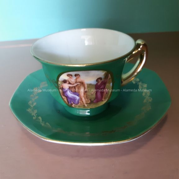 DEMITASSE-SIZE CUP AND SAUCER IN A DARK GREEN COLOR, TRIMMED IN GOLD. CUP HAS AN OVAL-SHAPED PANEL CONTAINING A TRANSFER DESIGN OF GREEK OR ROMAN MULTICOLORED FIGURINES (AFTER THE ARTIST ANGELICA KAUFMAN). PORCELAIN IS SIGNED, "A J CO., MADE IN CZECHOSLOVAKIA."