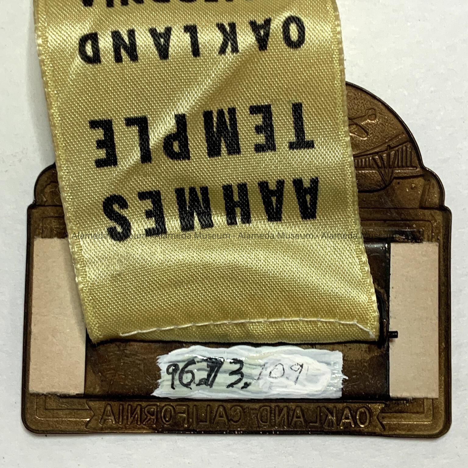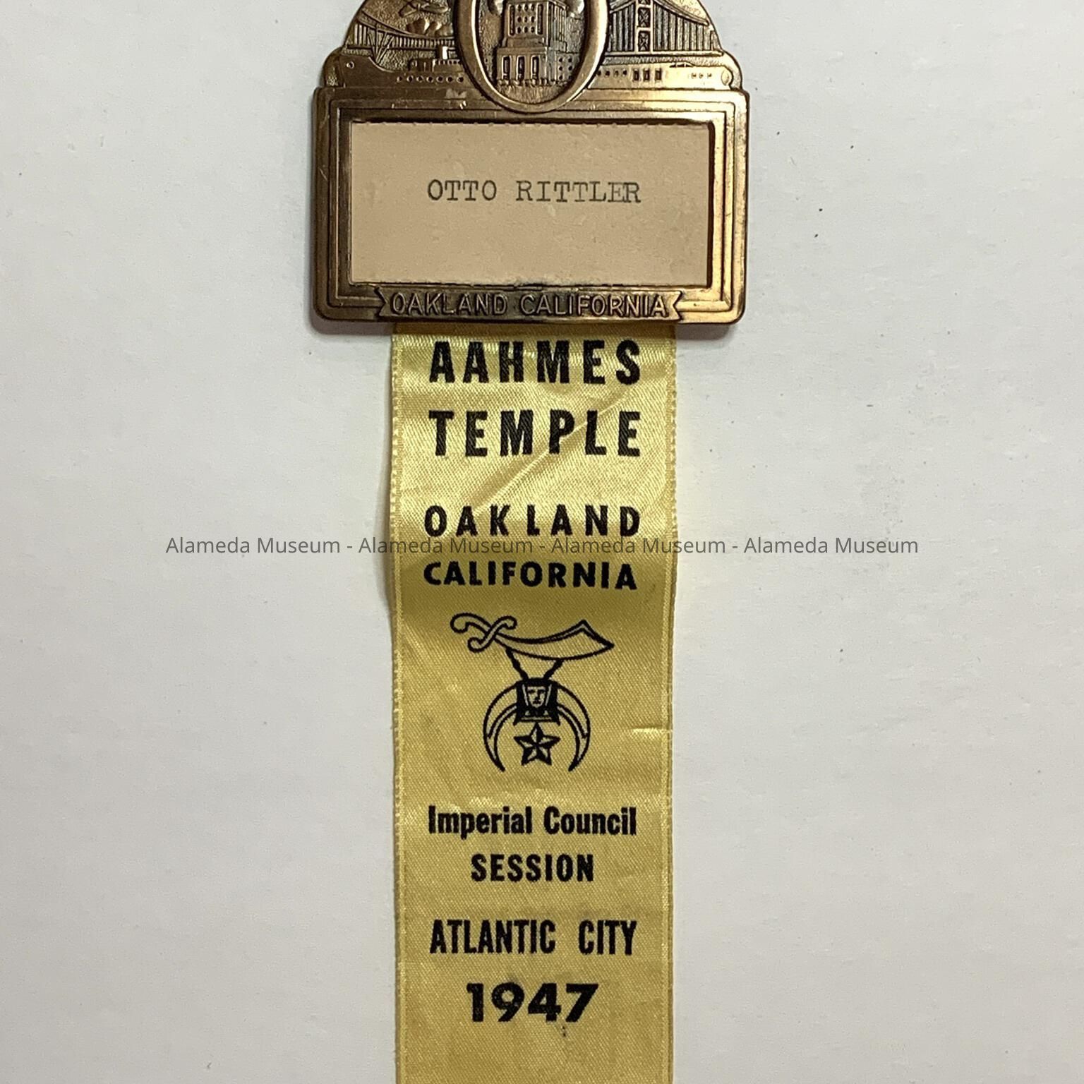 A MEMBERSHIP BADGE REPRESENTING THE AAHMES TEMPLE, OAK LAND, CALIFORNIA. BADGE WAS WORN BY OTTO RITTLER TO AN EVENT IN ATLANTIC CITY, NJ.