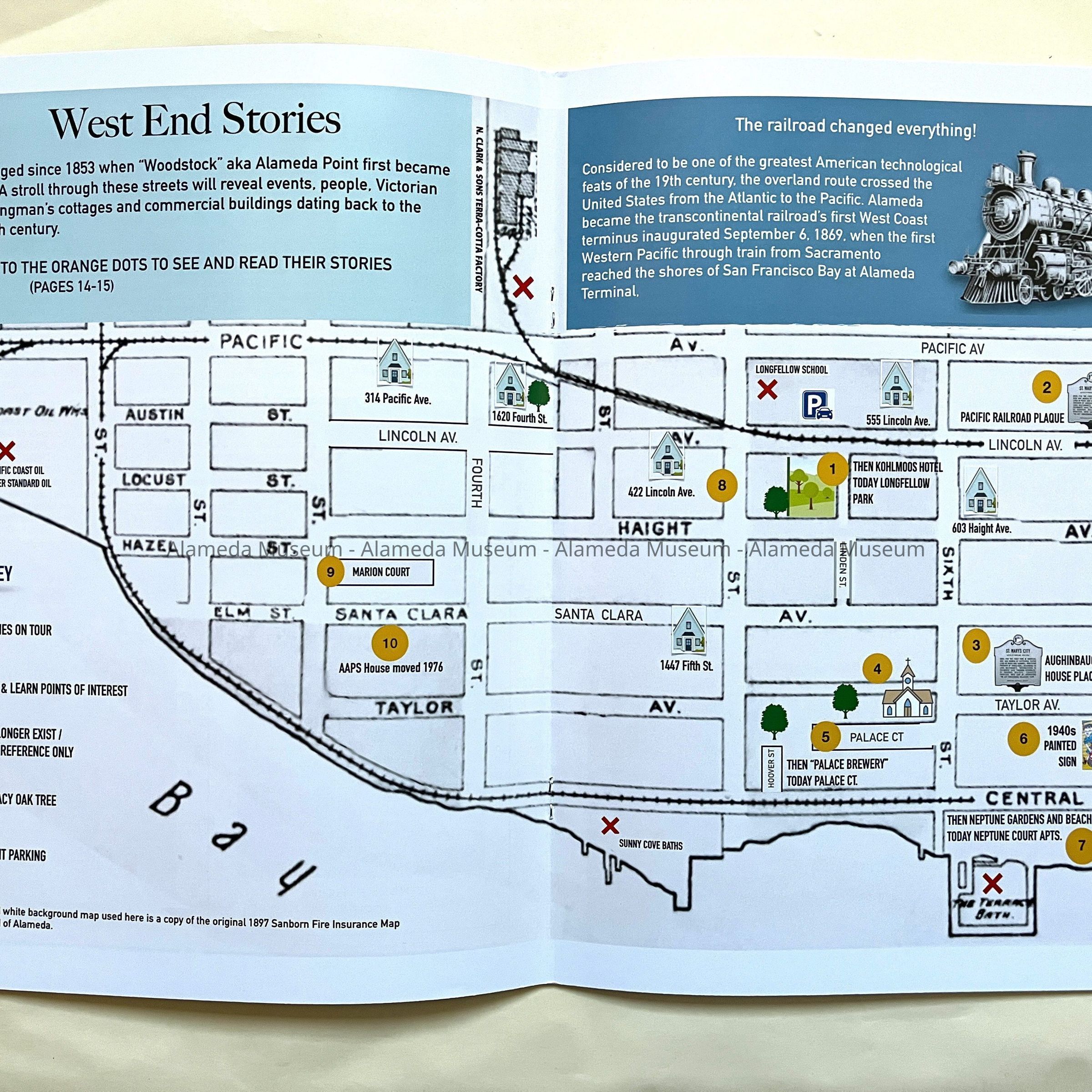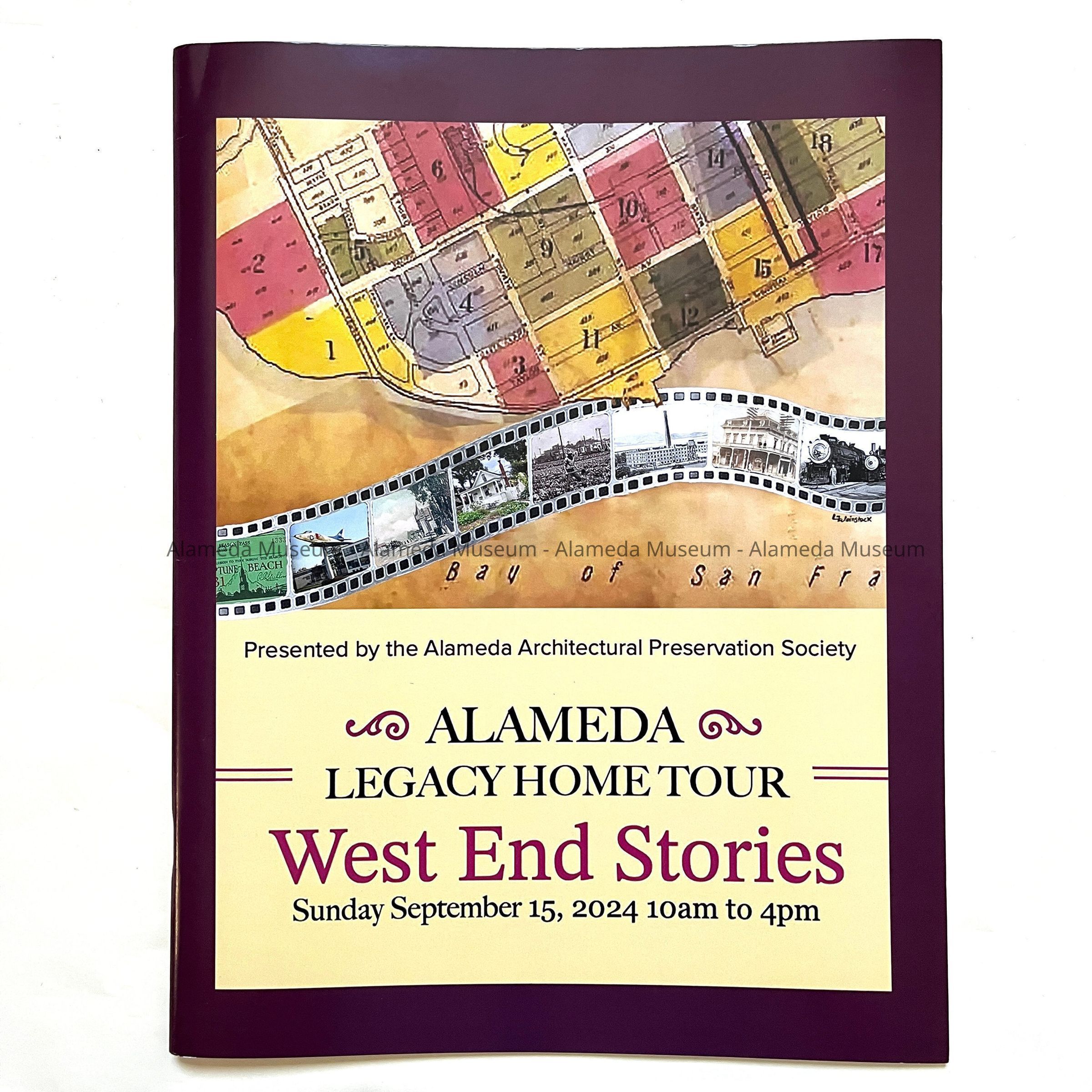 Description: A color booklet, 32 pages, of printer paper with colored images, with covershowing an image of an old tract map and a film of photos. Title is: 'Alameda Legacy Home Tour / West End Stories'. Presented by the Alameda Architectural Preservation Society, September 15, 2024. Back cover has a Home Tour Map.