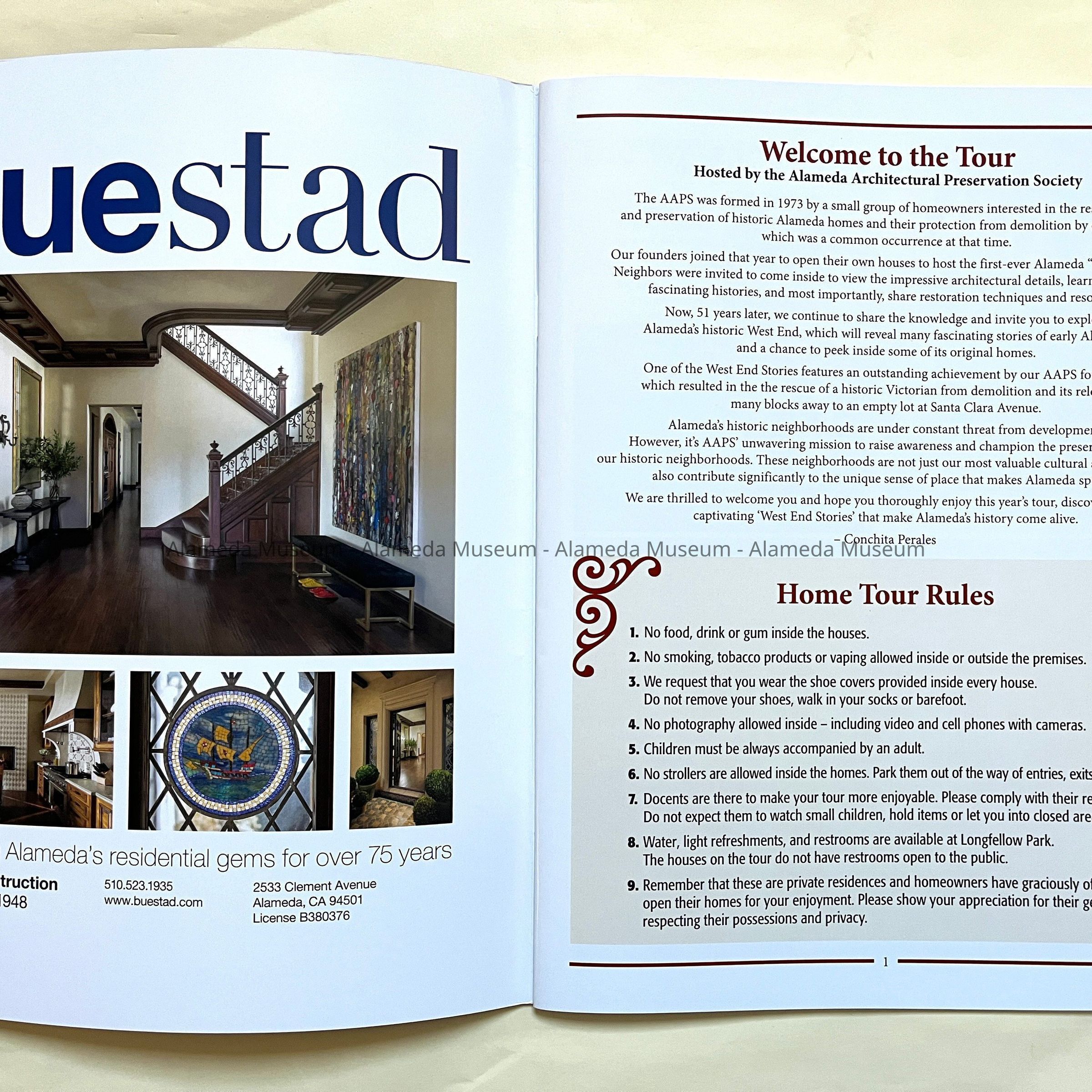 History of Object: Booklet for the Legacy Home Tour of September 2024, the primary fundraising activity for the Alameda Architecural Preservation Society. Homes opened for the tour were: 314 Pacific Avenue; 1620 Fourth Street; 422 Lincoln Avenue; 1447 Fifth Street; 555 Lincoln Avenue; 603 Haight Street; 1400 Webster Street.
