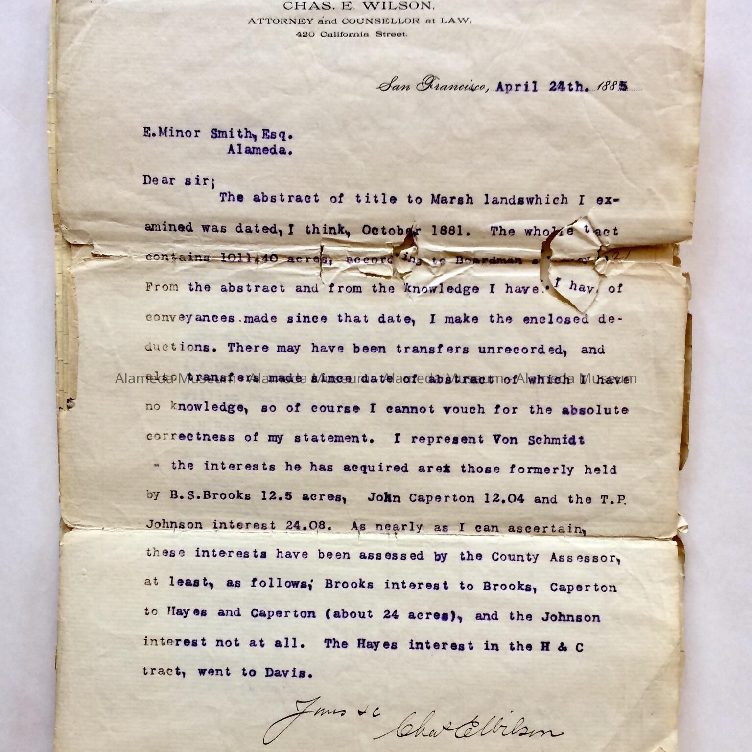 Abstract of Title on the Marshlands, North side of Encinal San Antonio (Alameda). The accompanying letter is addressed to E. Minor Smith, City Assessor, from Charles E. Wilson, Attorney, San Francisco. The letter is dated April 24, 1885 and makes reference to the Abstract of Title.