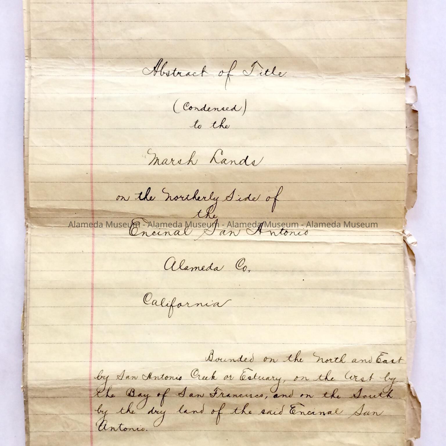 Description: 12-page document, handwritten on ruled paper. Cover has a caption in sepia-colored ink, "Abstract of Title." Document also includes a map of Encinal San Antonio (Alameda). Document has accompanying two-page letter and index in purple colored type.