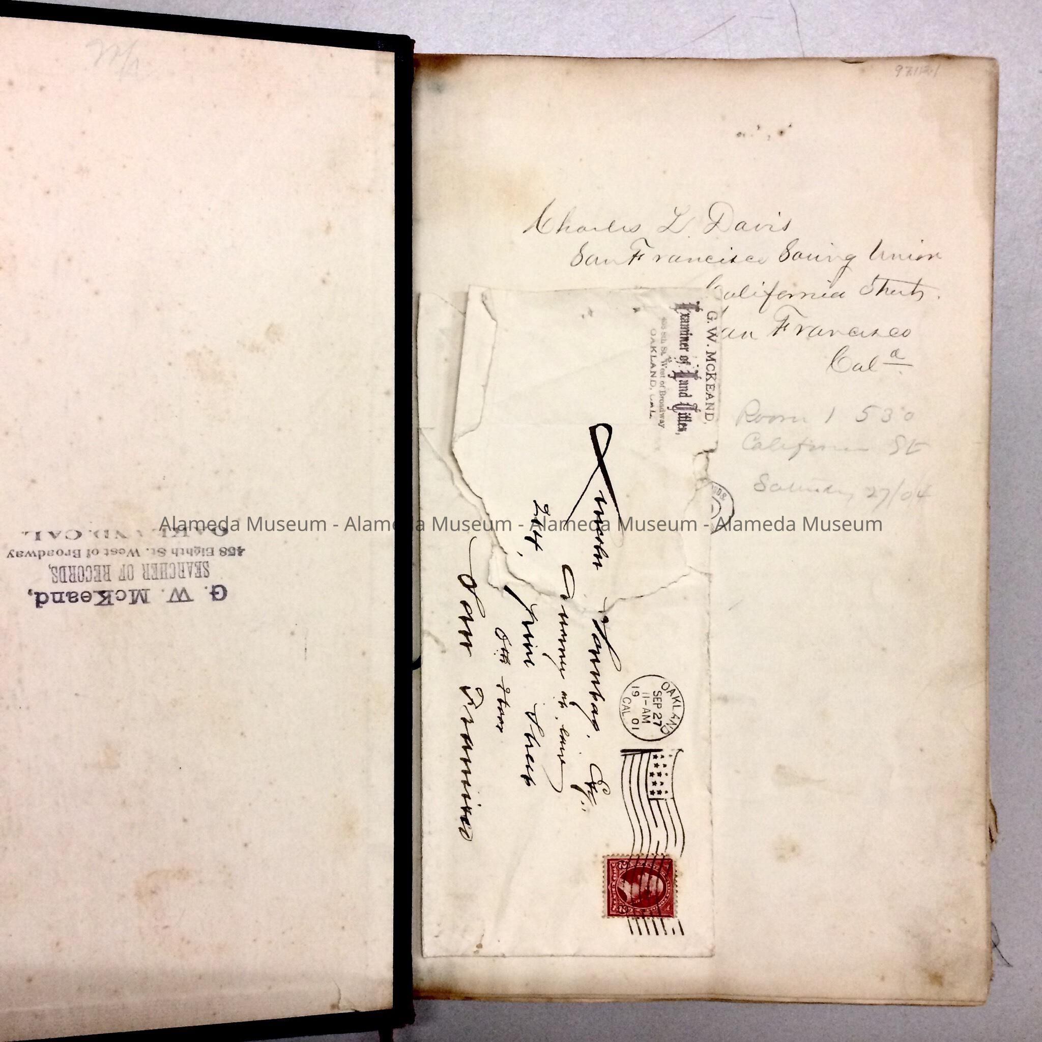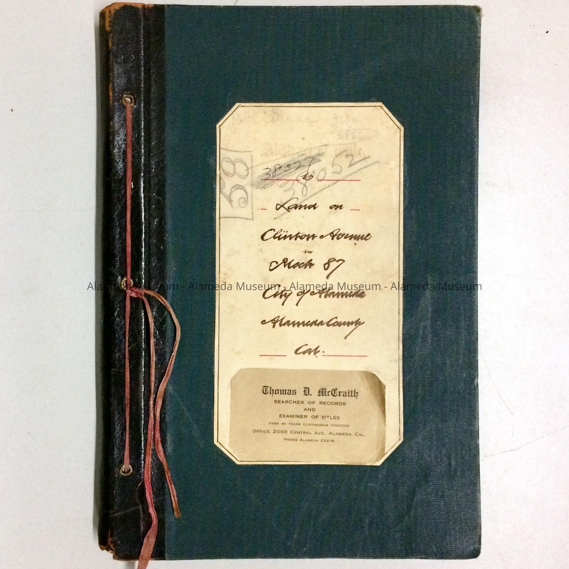 ABSTRACT OF TITLE FOR LAND ON CLINTON AVENUE, BLOCK 87, CITY OF ALAMEDA. THE ABSTRACT OF TITLE DISPLAYS NAME OF PROPERTY OWNER, NAME OF AN ALAMEDA LOT, NOW KNOWN AS 2008 CLINTON AVE. THE DOCUMENT TRACES OWNERSHIP FROM THE SPANISH LAND GRANT OF 1820 TO PERALTA TO THE SUBSEQUENT PURCHASE BY ROBERT H BLAKE, FATHER OF THE LATE DOROTHY DYER, IN 1904.
