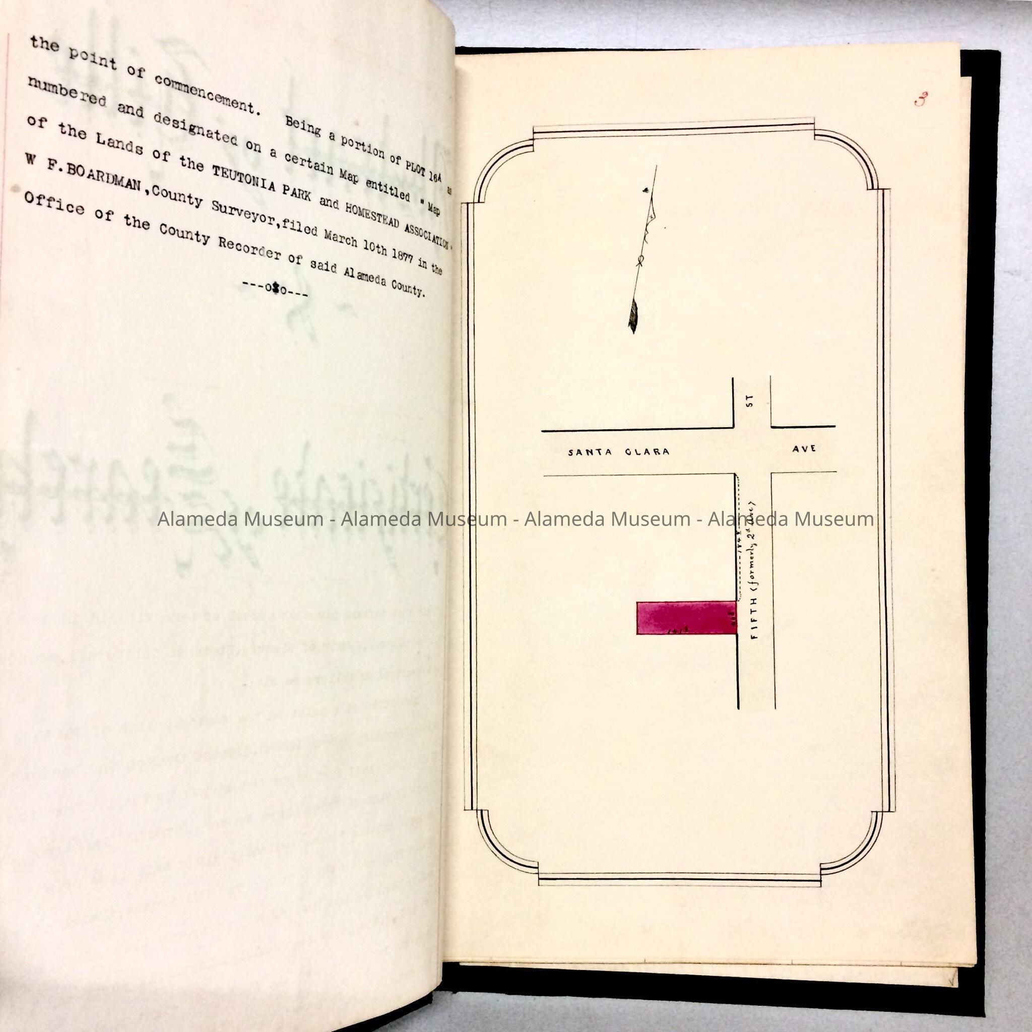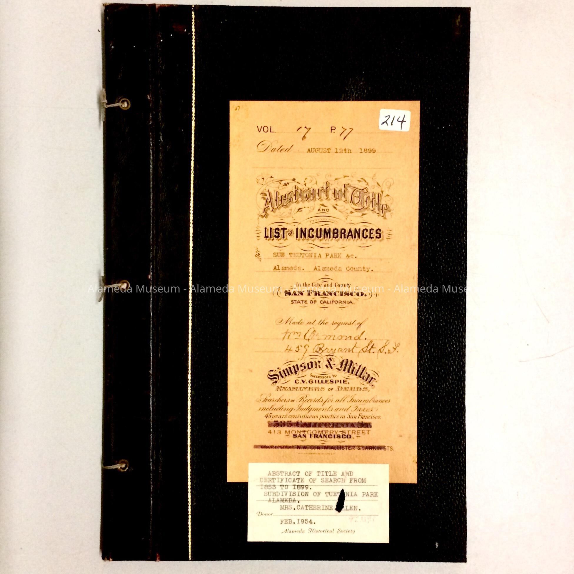 TYPEWRITTEN "ABSTRACT OF TITLE," WITH WHAT APPEARS TO BE A HAND-DRAWN MAP INDICATING LOCATION OF PROPERTY. THE ABSTRACT TRACES OWNERSHIP OF PROPERTY FROM 1853 TO 1899. THE PROPERTY IN QUESTION IS LOCATED ON FIFTH STREET, 184-FEET SOUTH, FROM SANTA CLARA AVENUE, ALAMEDA, CA. ORIGINALLY NUMBERED "214" AND PRESENTED TO THE ALAMEDA HISTORICAL SOCIETY IN 1954, BUT NEVER CATALOGED UNTIL 1997.