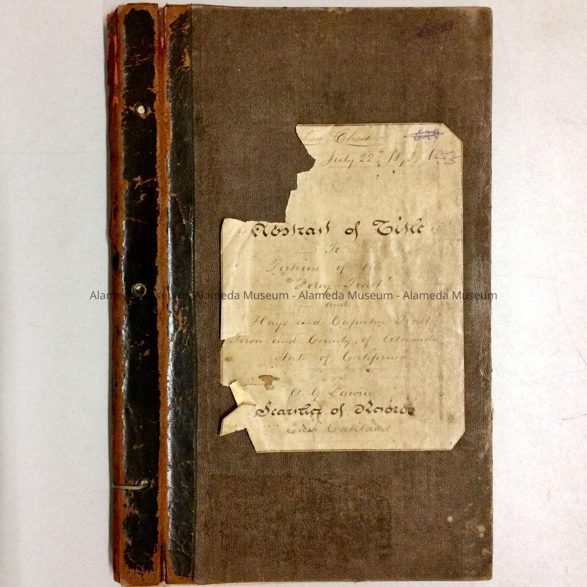 HARD-BOUND LOOSE-LEAF BOOK, WITH COVER OF BROWN-COLORED BUCKRAM, TRIMMED IN DARKER BROWN-COLORED LEATHER. COVER HAS ATTACHED PAPER LABEL, HANDWRITTEN, IN SEPIA INK. BOLD CAPTION STATES, "ABSTRACT OF TITLE."
