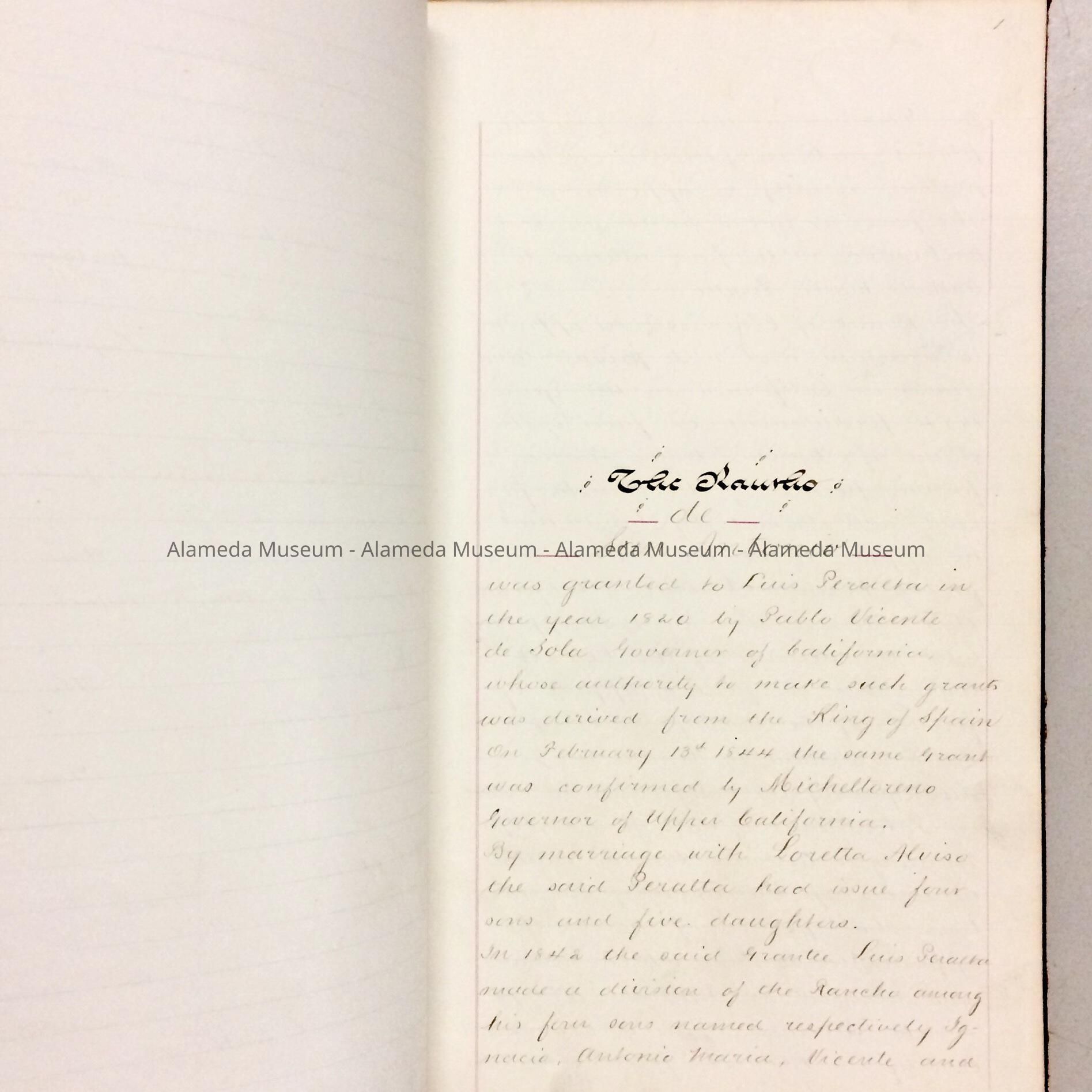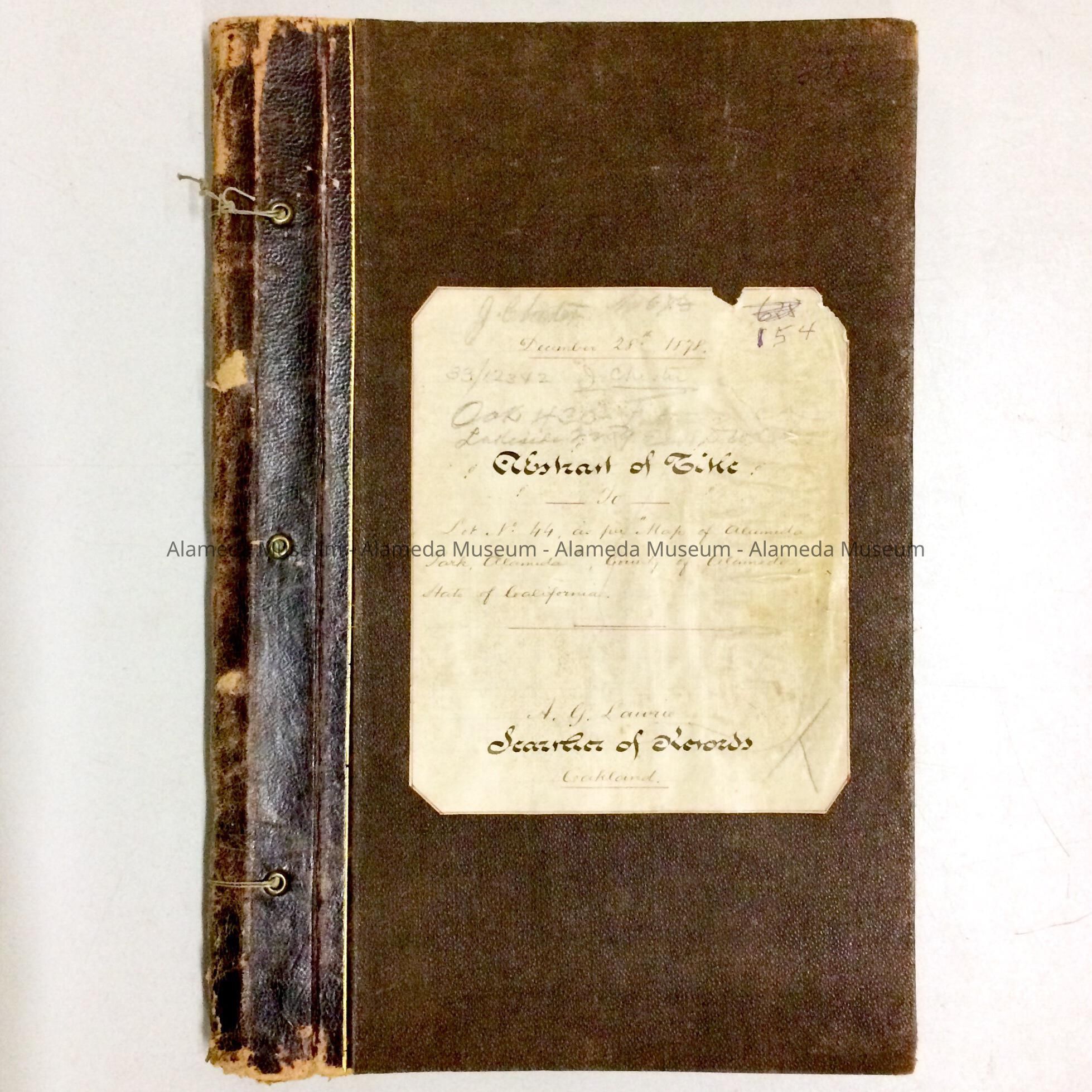 HANDWRITTEN AND ILLUSTRATED MAP OF ABSTRACT OF TITLE FOR PROPERTY KNOWN AS LOT 44, ALAMEDA PARK TRACT. THE PROPERTY, KNOWN AS 1224 AND 1226 PARK AVENUE, AND 1229 REGENT STREET, IS TRACED FROM 1851 TO 1878. THIS DOCUMENT WAS ORIGINALLY PART OF THE ALAMEDA HISTORICAL MUSEUM COLLECTION PRIOR TO 1971; WAS NUMBERED "154," AND NEVER OFFICIALLY CATALOGED UNTIL 1997.