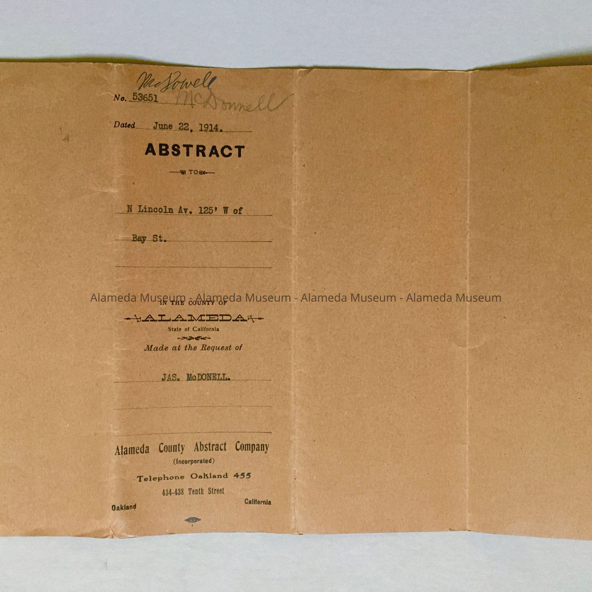 AN ABSTRACT OF TITLE RELATING TO PROPERTY ON THE NORTH SIDE OF LINCOLN AVENUE, ALAMEDA, 125 FEET WEST OF BAY STREET. THE DEED IS BETWEEN THOMAS J AND MARY MURRAY AND JAMES MCDONELL, 1041 LINCOLN AVENUE. JAMES MCDONELL WAS THE UNCLE OF ROBERTA MCDONELL.