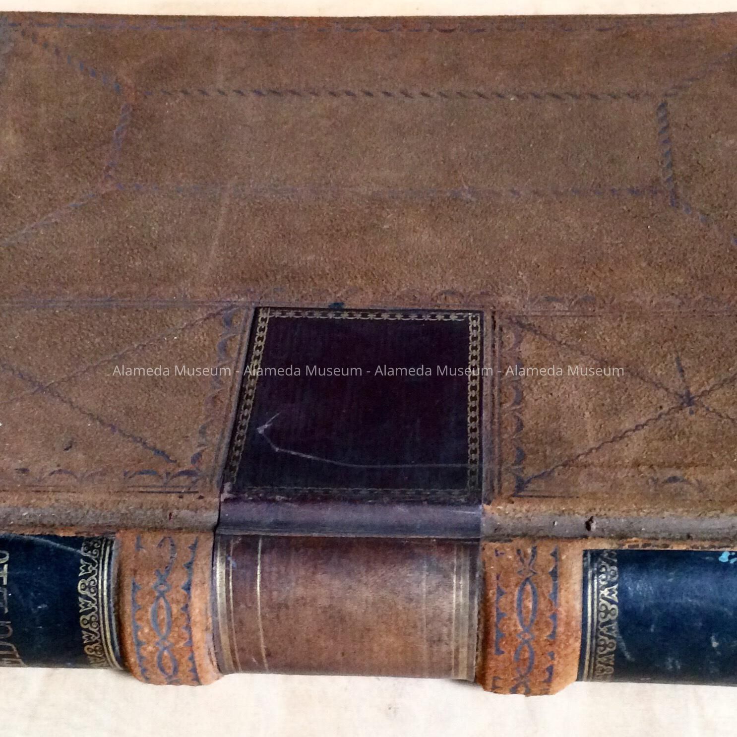 Description: Hard bound ledger book, brown colored leather cover with darker brown leather trim accentuated with gold. The title "Ledger" printed in incised lettering (gold) on spine.