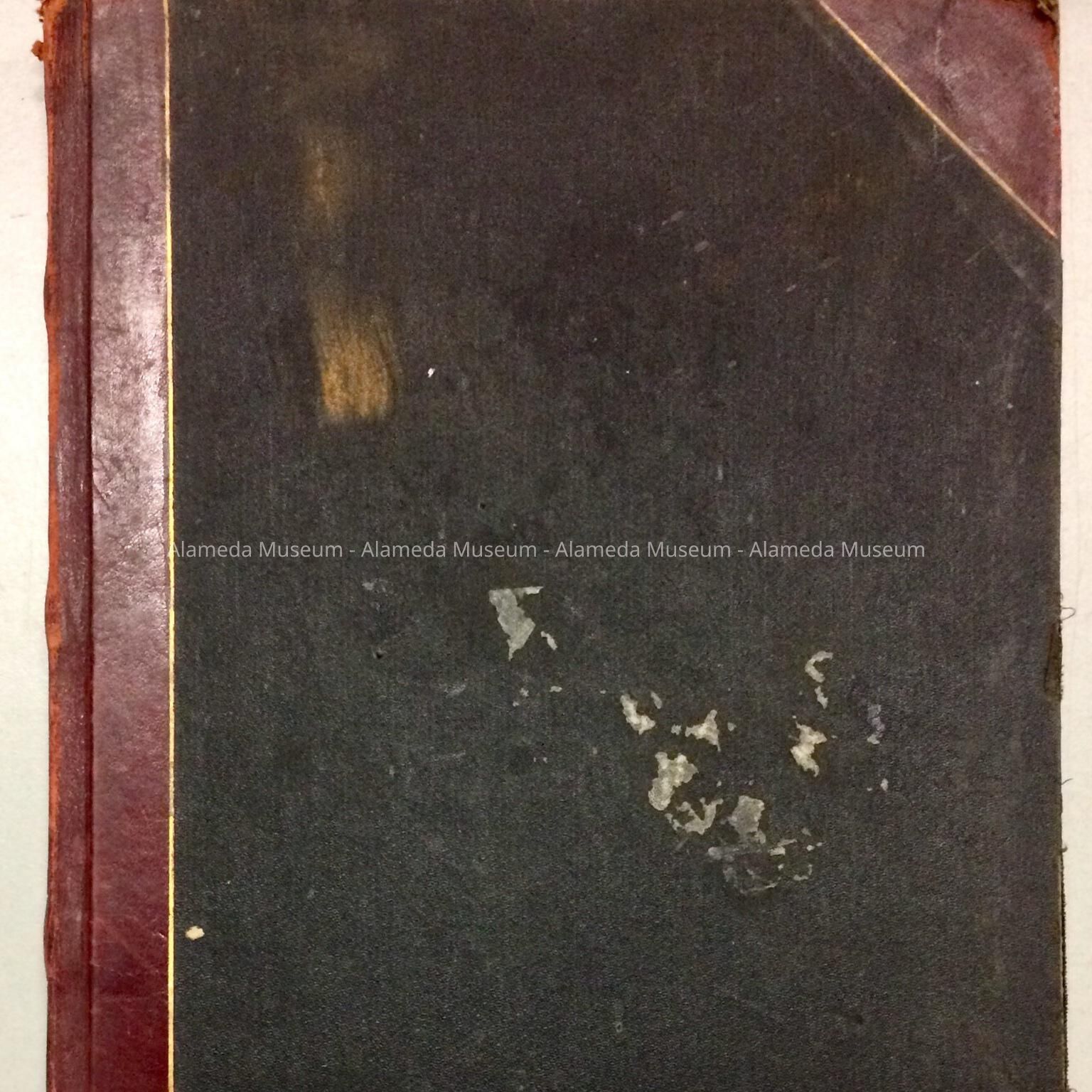 HARD-BOUND BOOK, WITH COVER OF BLACK IMITATION LEATHER/ BUCKRAM, TRIM OF WINE-COLORED LEATHER AND GOLD ACCENTS. CONTENTS ARE HANDWRITTEN ENTRIES.