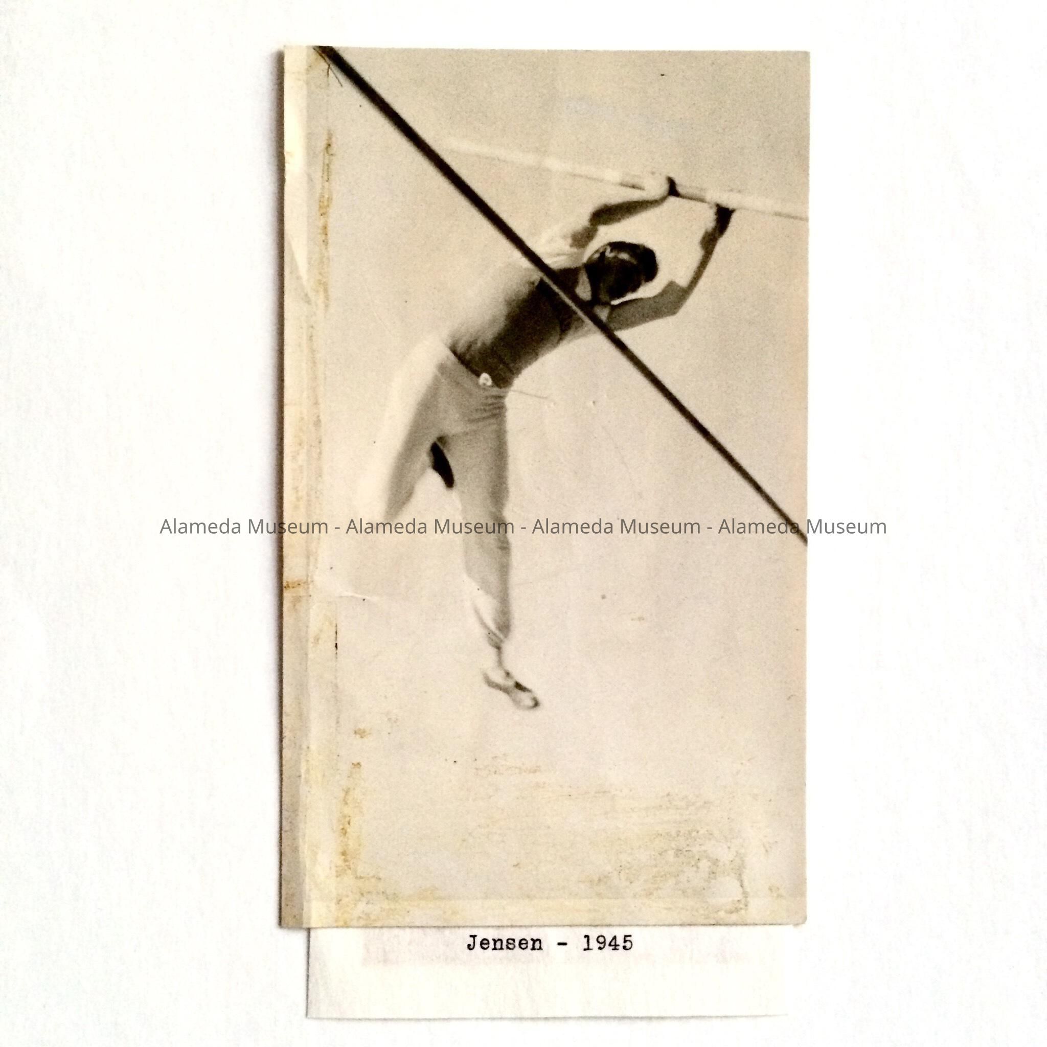 AN ACTION PHOTOGRAPH OF A STUDENT, NAMED JENSEN, IN THE ACT OF POLE VAULTING, DATED 1945, ALAMEDA HIGH SCHOOL.