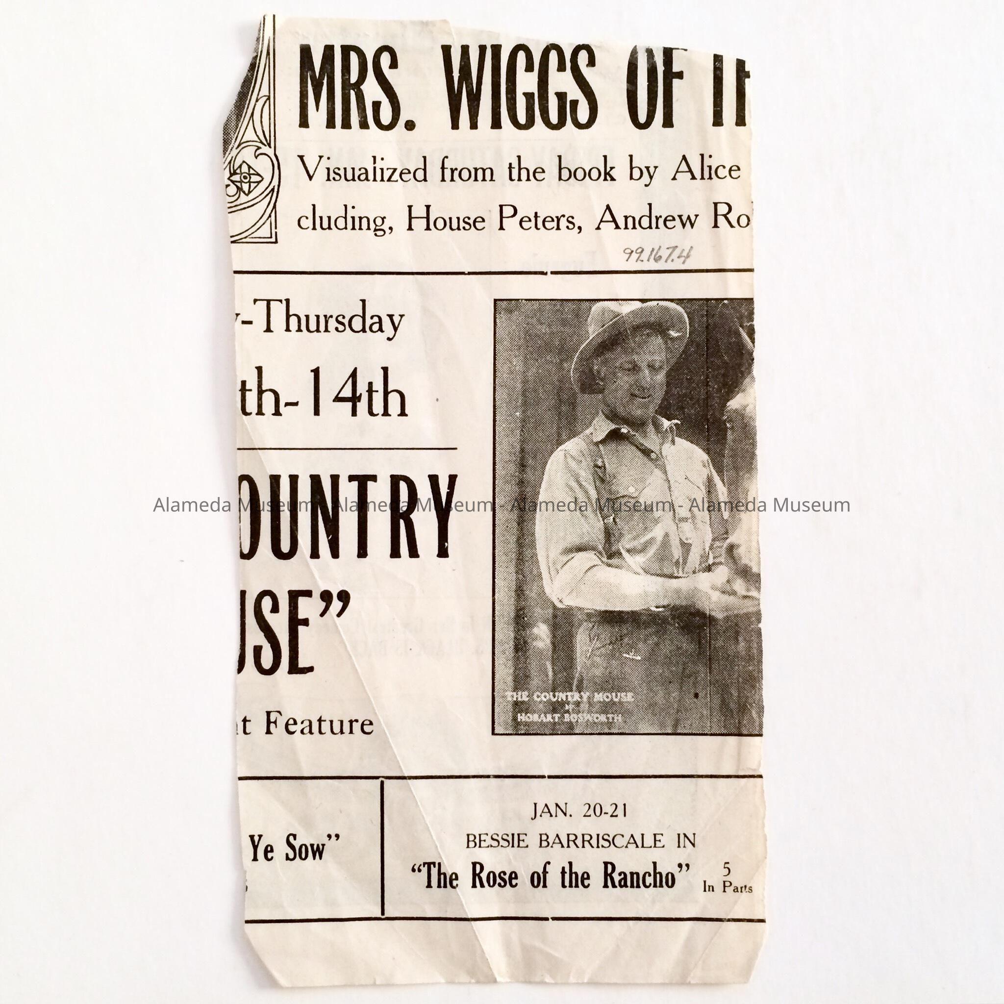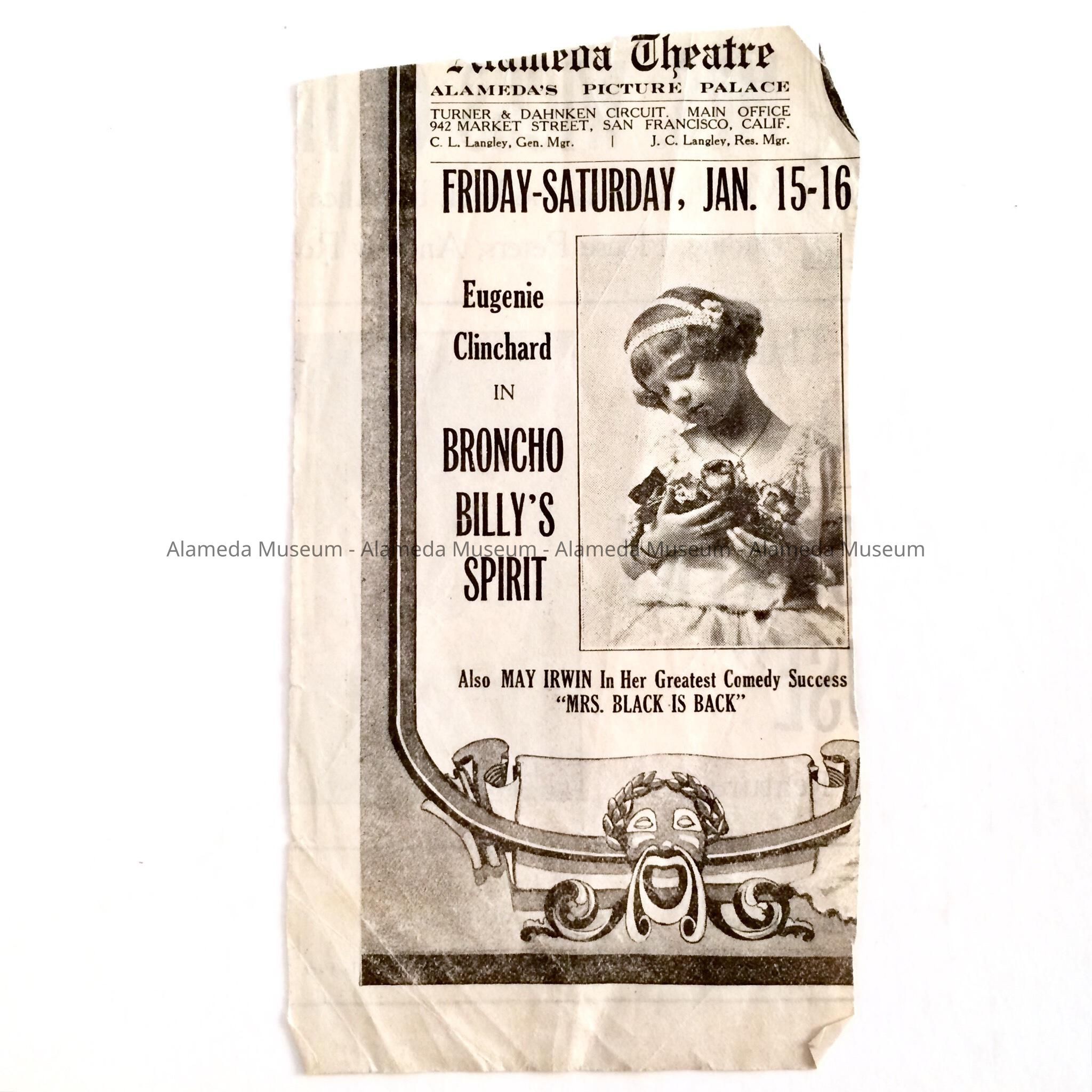 History: Ad for coming attractions at the Alameda theater, Park Street, announcing the movie, "Bronco Billy's Spirit" starring Eugenia Clinchard, the Alameda child actress. Bronco Billy was one of the early western stars.