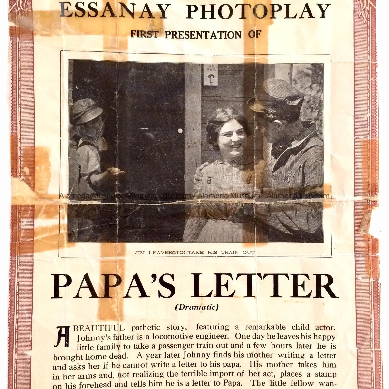 Ad for the Essanay Photoplay "Papa's Letter," featuring the Alameda born child actress Eugenia Clinchard. The movie was made at Niles, California.