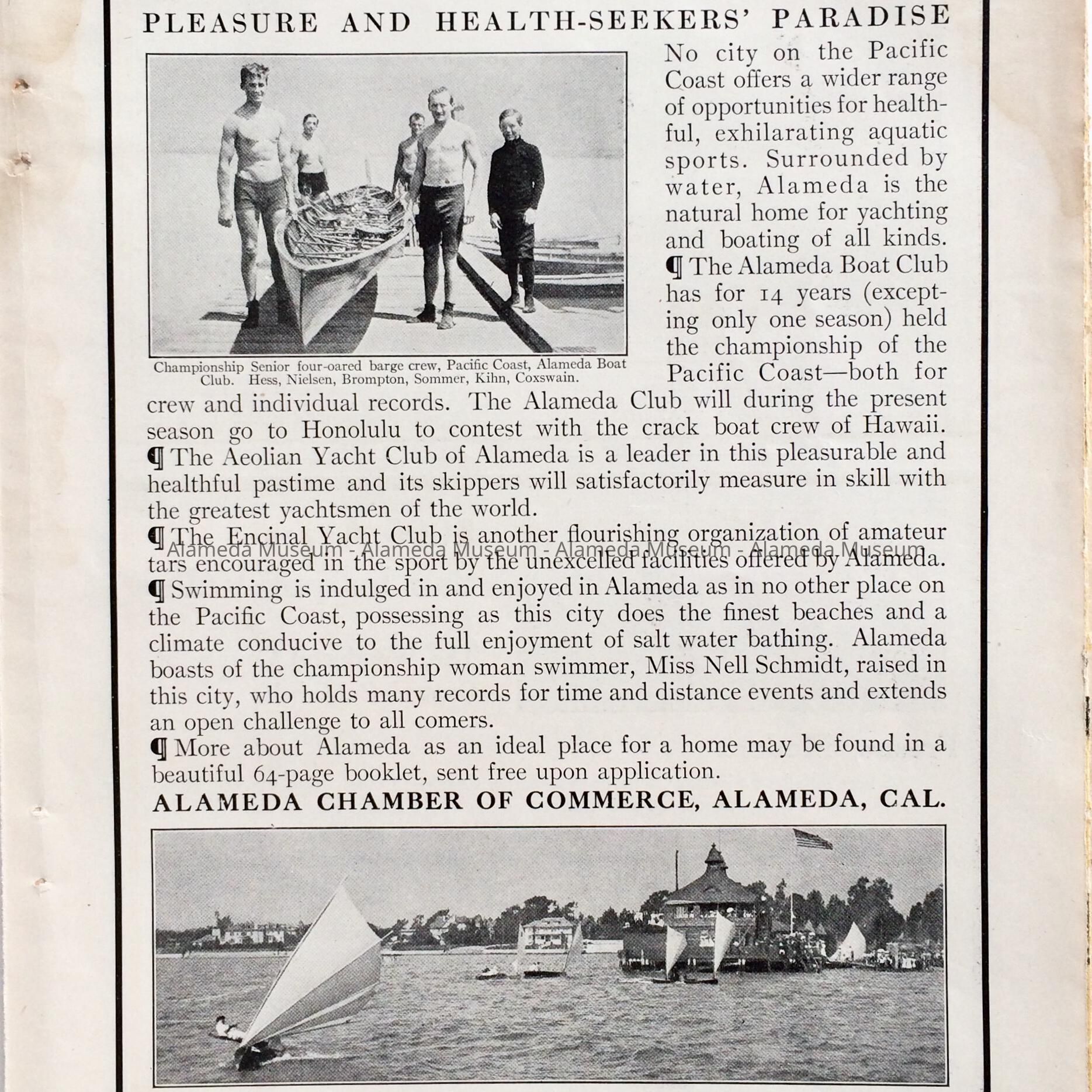 History of Object: Ad placed by the Alameda Chamber of Commerce extolling the virtues of Alameda as an aquatic sports paradise. Texts refers to the Aeolian & Encinal Yacht Clubs. Illustrated with a photo of the Encinal Yacht Club, foot of Grand Street. Ad removed from a April, 1912 edition of the Sunset Magazine.