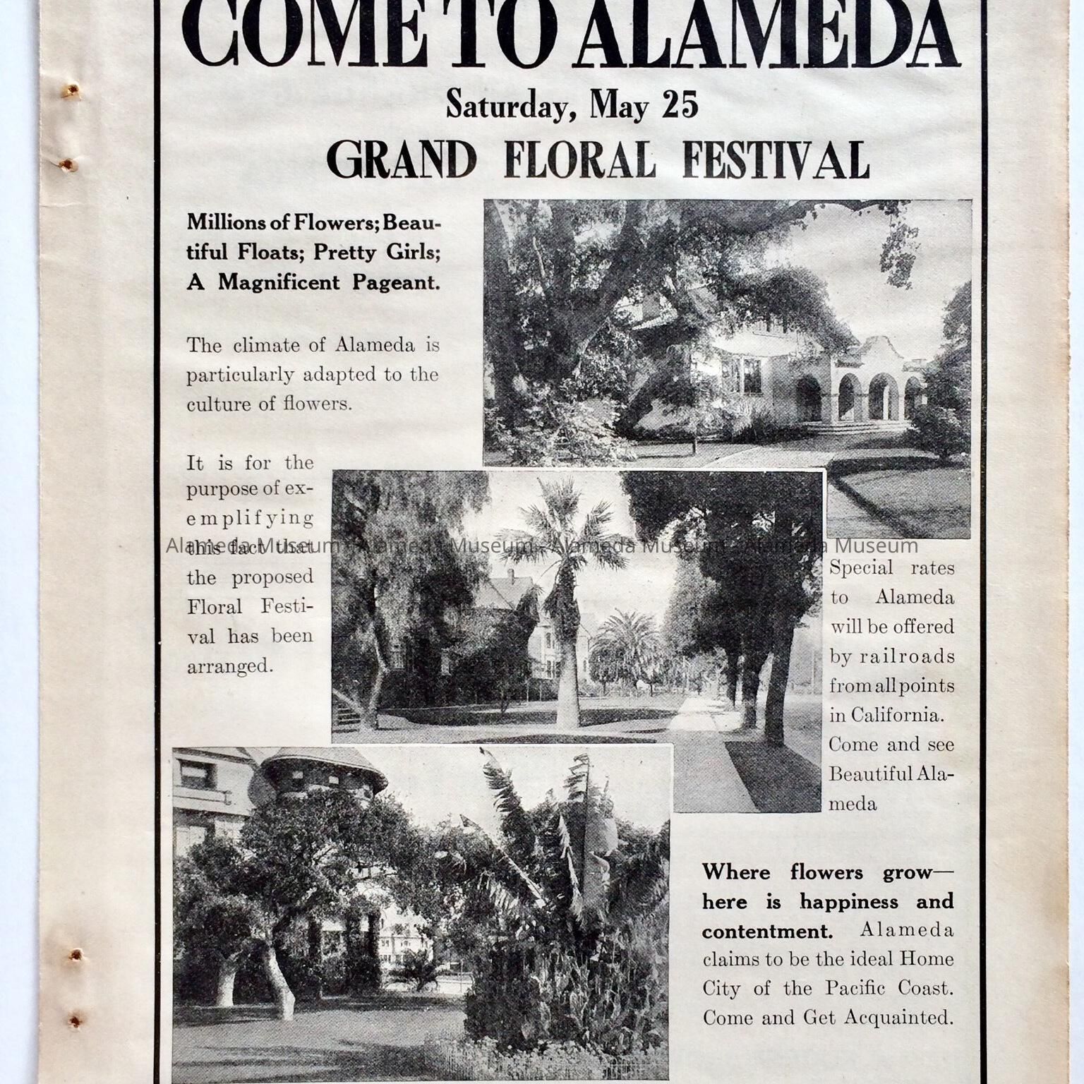 History of Object: Ad inviting the public to visit Alameda, Saturday, May 25, 1912 to a Grand Floral Festival (pageant), placed by the Alameda Chamber of Commerce. The ad was removed from the May, 1912 edition of the Sunset Magazine.
