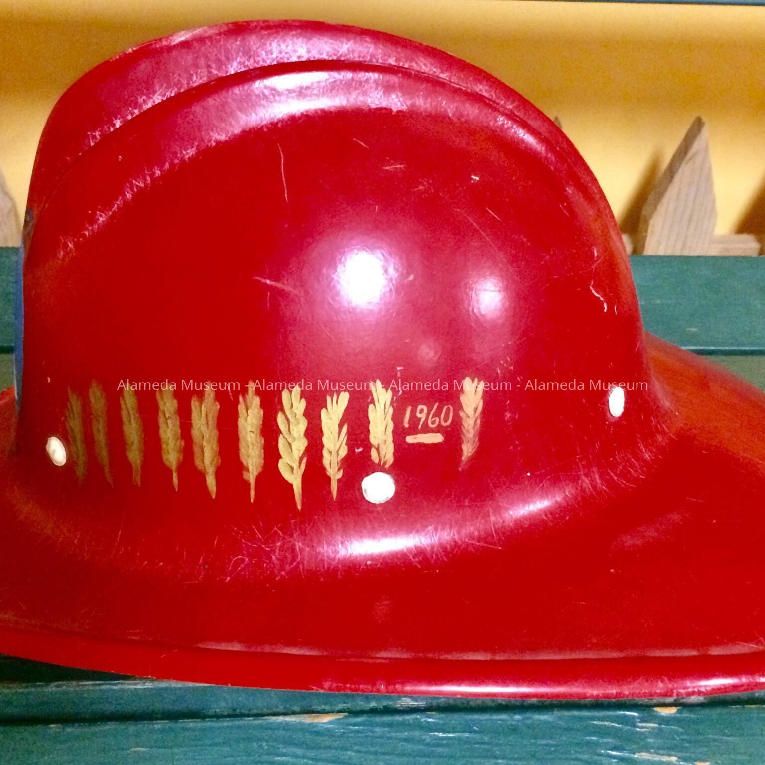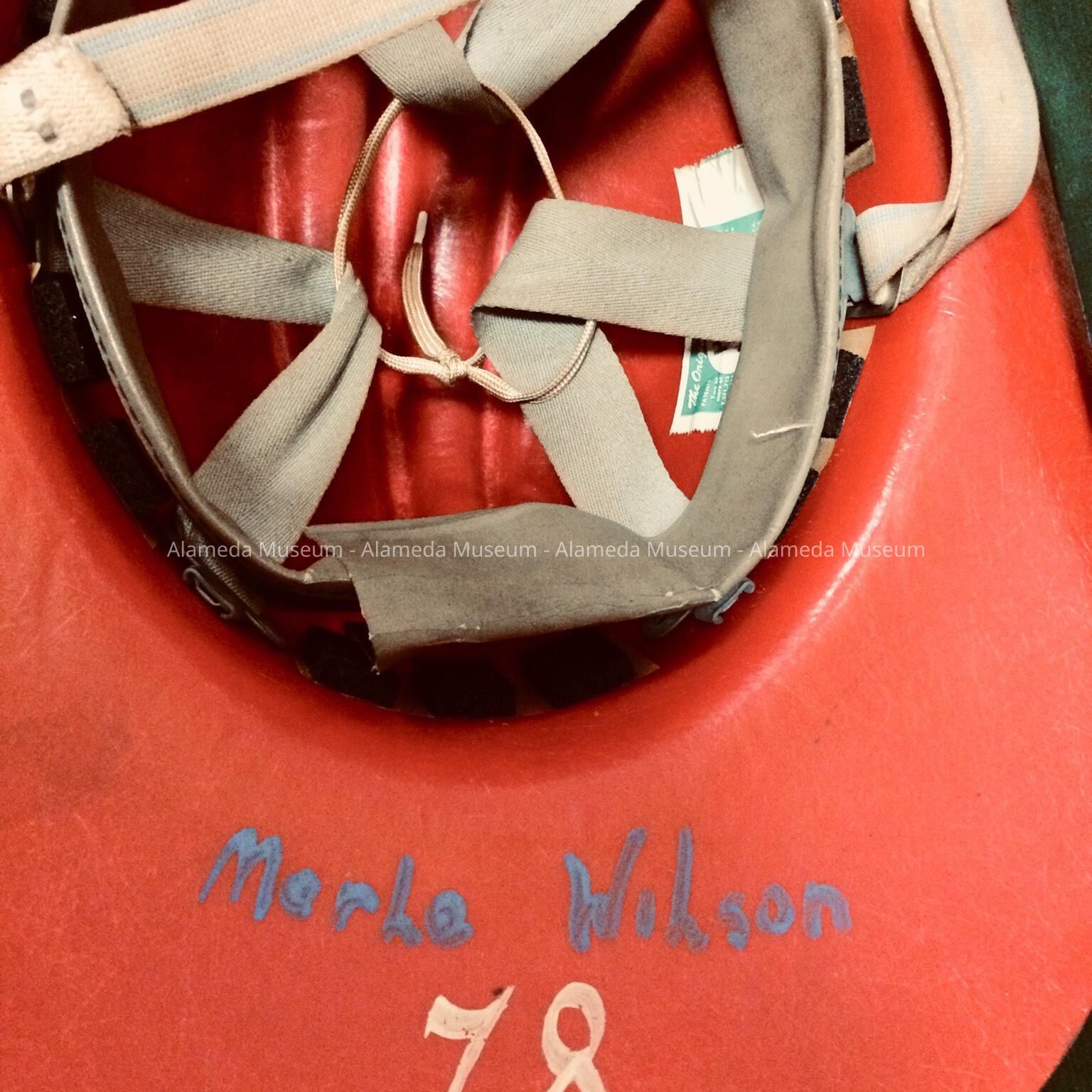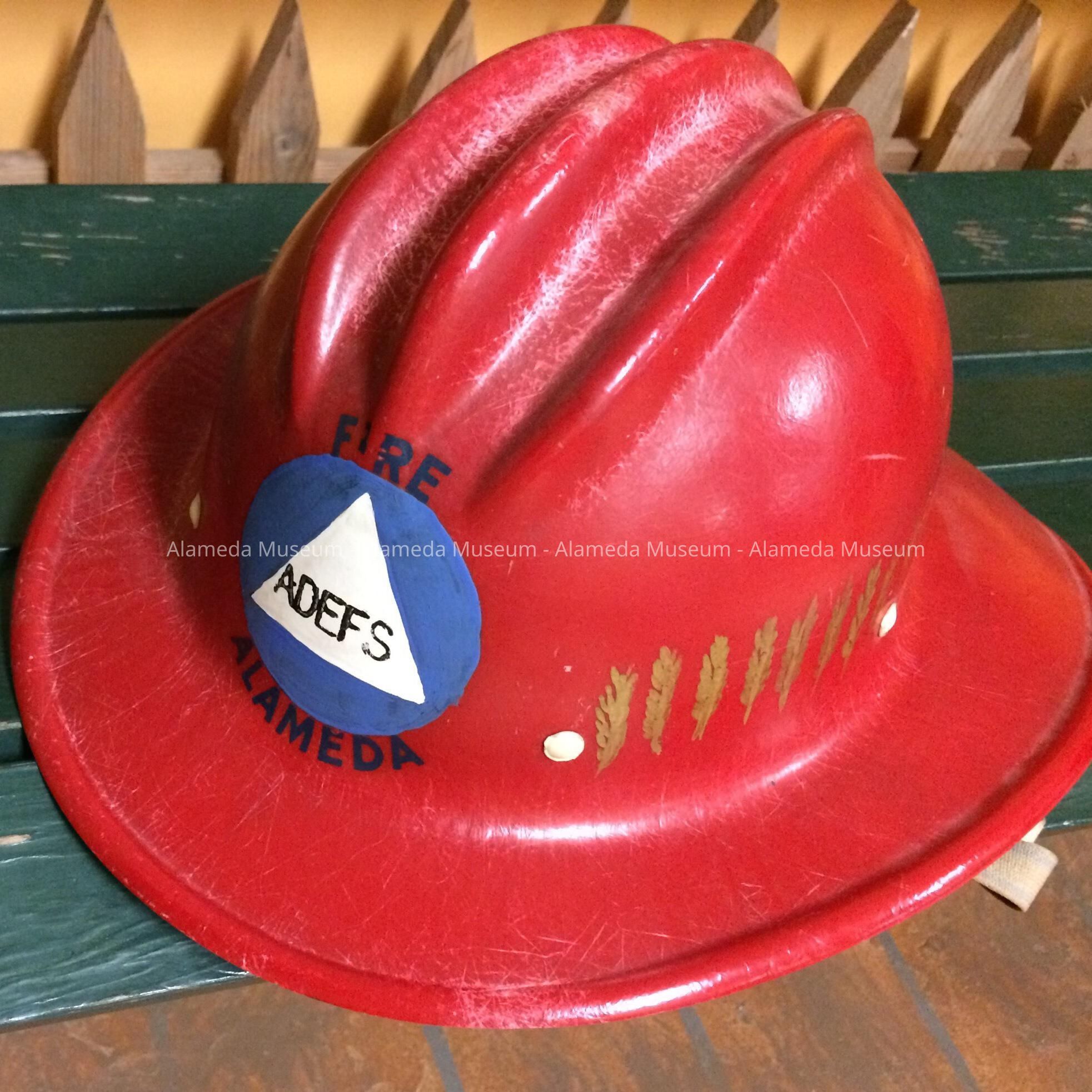 Description: Helmet fabricated from red colored plastic. A hand painted insignia on the front of the helmet has a triangular shaped emblem with the letters ADEFS on a circular shaped blue colored background and caption "Fire Alameda". Interior of bill of helmet has hand painted inscription Merle Wilson and the number 78.