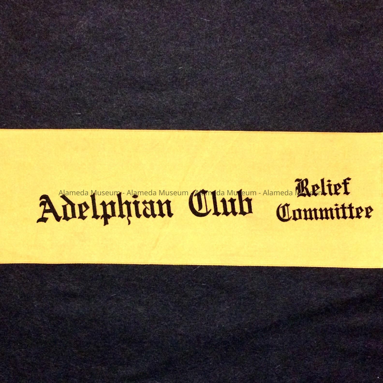 RIBBON WORN BY MEMBERS OF THE ADELPHIAN CLUB, WHO AIDED IN THE RELIEF SERVICES TO THE VICTIMS OF THE SAN FRANCISCO EARTHQUAKE AND FIRE OF 1906. THIS PARTICULAR RIBBON WAS WORN BY MRS PHILLIP S TELLER, ONE-TIME PRESIDENT OF THE ADELPHIAN CLUB.