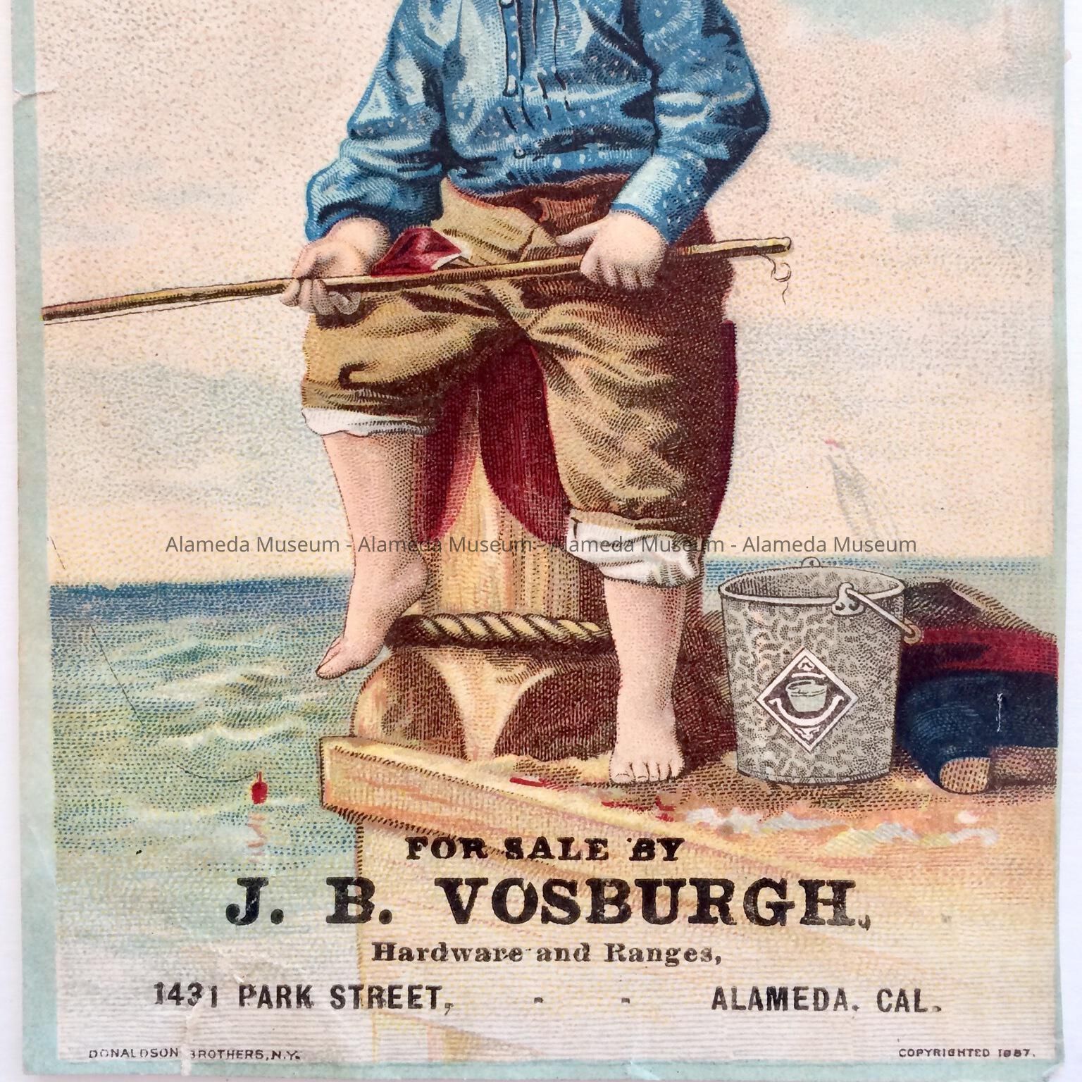 History of Object: Late 19 th Century trade card advertising J. B. Vosburgh, Hardware and Ranges 1931 Park St., Alameda. Vosburgh, an early merchant, lived at 2625 Central Ave. in a house he had built in 1887.