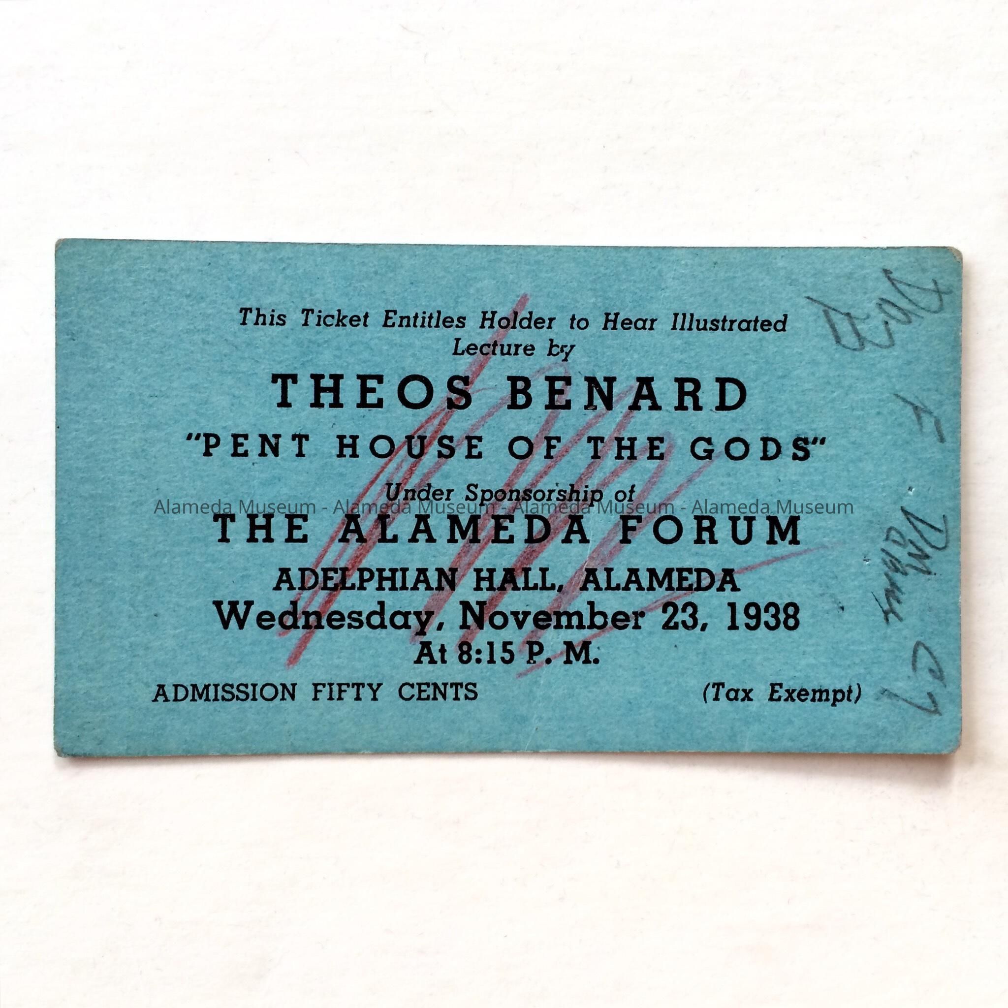 A TICKET, ADMITTING THE HOLDER TO HEAR AN ILLUSTRATED LECTURE BY THEOS BENARD, ENTITLED "PENTHOUSE OF THE GODS," TO BE HELD AT THE ADELPHIAN CLUB ON DECEMBER 23, 1938.