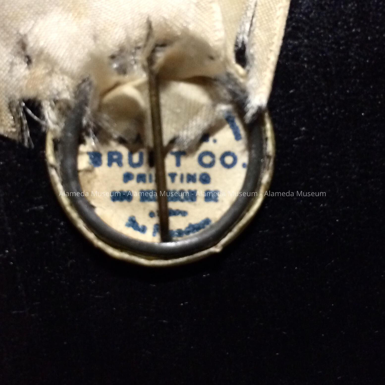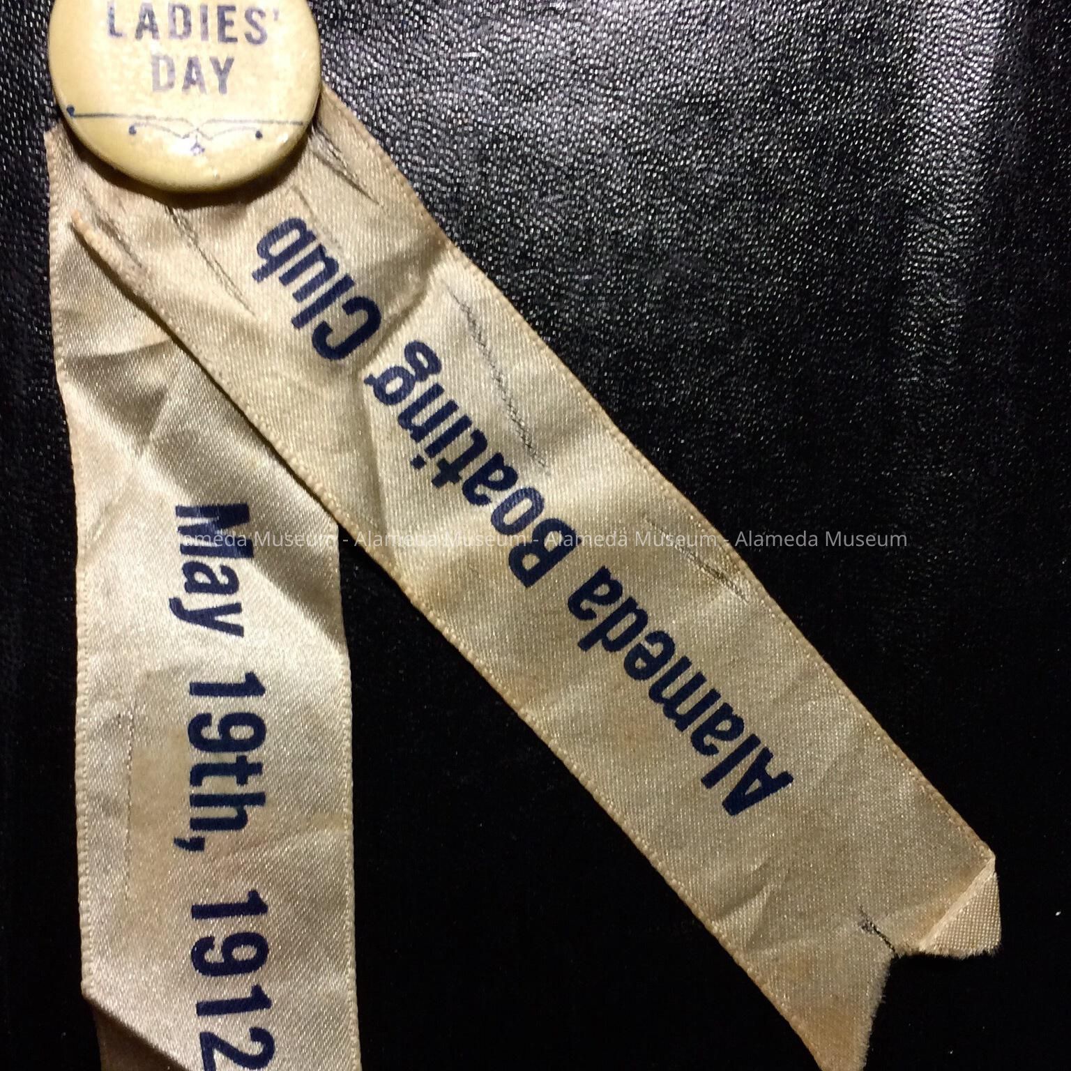 Description: Celluloid covered tin button stating in blue type "Ladies Day", from which is suspended two white silk ribbons with print type in blue (left) May 19th, 1912, (right) Alameda Boating Club,