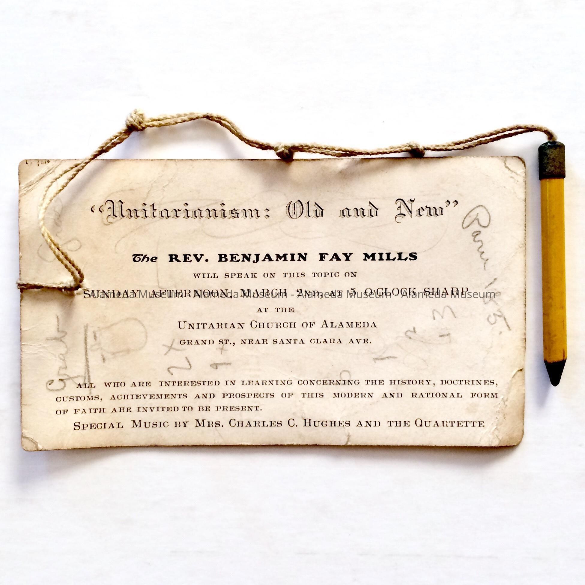 ADMITTANCE CARD FOR A SPEECH TO BE PRESENTED BY REVEREND BENJAMIN FAY MILLS, ON MARCH 2 (YEAR NOT INDICATED), AT THE UNITARIAN CHURCH, LOCATED ON GRAND STREET NEAR SANTA CLARA AVENUE, ALAMEDA, CALIFORNIA.