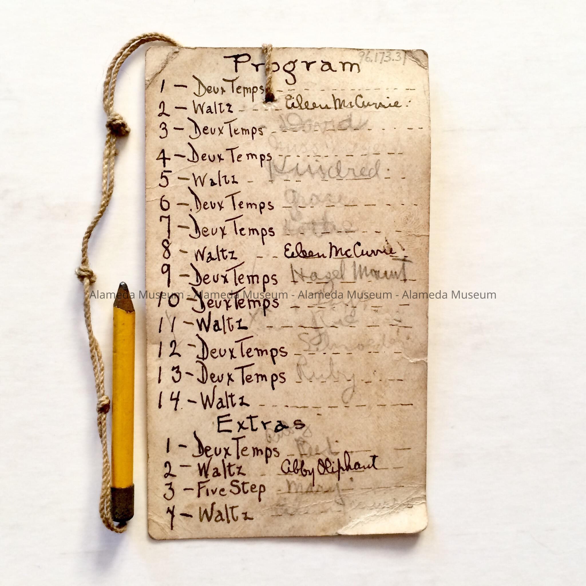 ADMITTANCE CARD AND PROGRAM, WITH BOLD-PRINTED CAPTION, "UNITARIANISM, OLD AND NEW," ON HEAVY PAPER STOCK. REVERSE SIDE DISPLAYS A HANDWRITTEN DANCE PROGRAM. LEAD PENCIL IS ATTACHED WITH STRING.