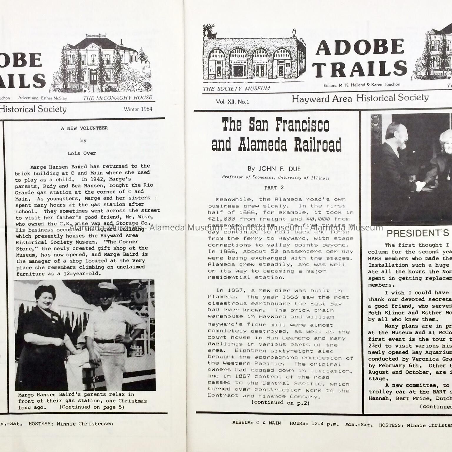 History: Publication entitled Adobe Trails issued by the Hayward Area Historical Society for winter 1984 and spring 1985. Publication has an article by John F. Due concerning the San Francisco and Alameda Railroad which was founded in 1864 by A.A. Cohen Alameda resident. The route being Alameda to Hayward. It was later used by the Central Pacific for the Trans Continental Railroad.