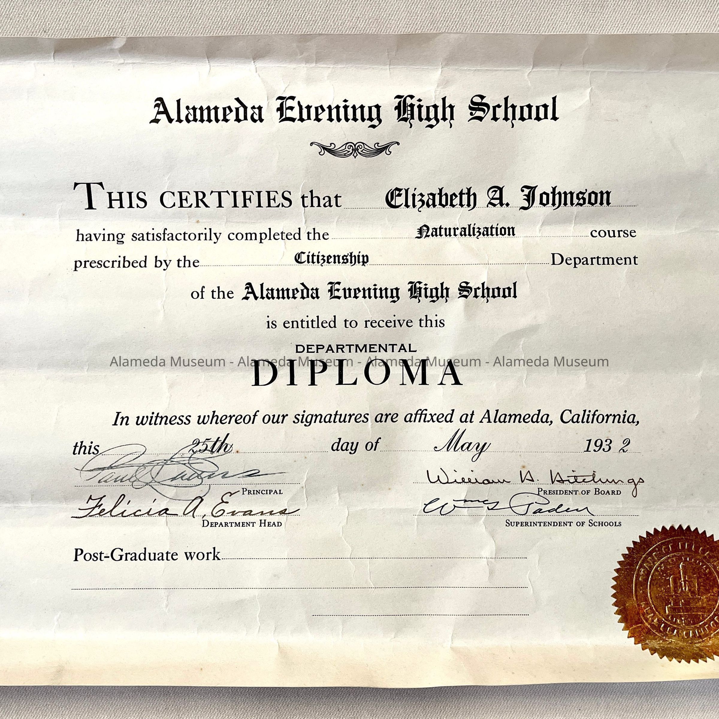 History of Object: Diploma issued to Elizabeth A. Johnson, for satisfactorily completing the Naturalization course prescribed by the Citizenship Department, Alameda Evening High School, dated May 25th, 1932.