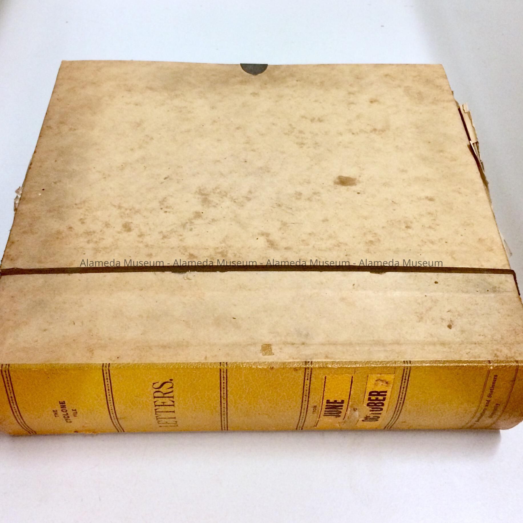 Description: File in the form of a pseudo-book, the spine of which has a textured paper resembling buckram. On the spine is imprinted: "Cyclone File", "Letters", in black color type on a mustard color background.
