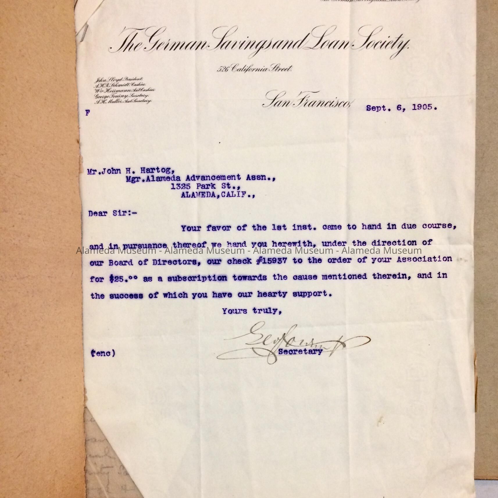 History of Object: File of correspondence to and from the Alameda Advancement Association (which was formed "to promote the welfare of the City of Alameda") for the year 1905. Other miscellaneous papers are included in this file, such as signed petitions, membership receipts, etc. This organization met monthly in the City Hall, and its directors consisted of prominent citizens.